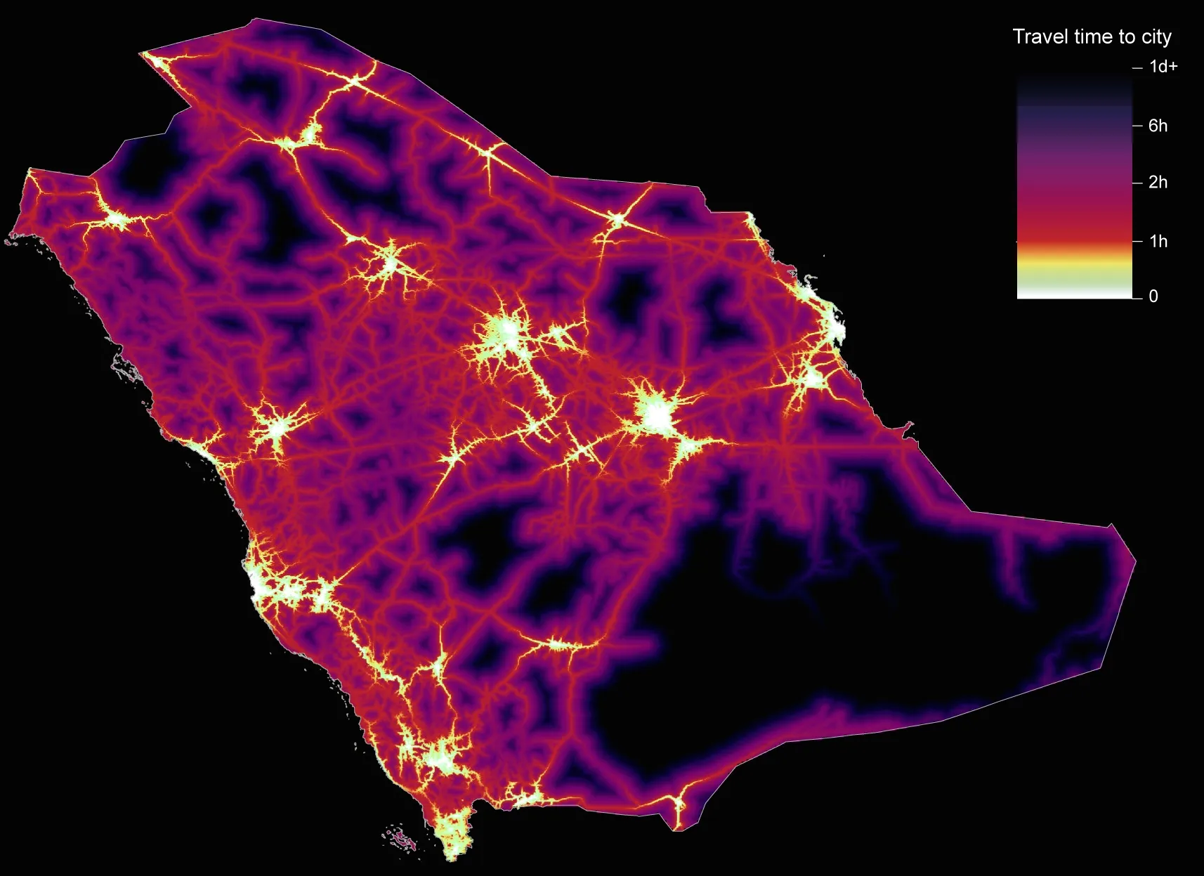 Saudi Arabia. With an overwhelmingly urban population – one of the highest of the countries analysed – Saudi Arabia has some of the longest travel times to city centres. It’s an exception to the relationship between high income and accessibility. (Photo by Daniel Weiss/Jennifer Rozier/Malaria Atlas Project/University of Oxford )
