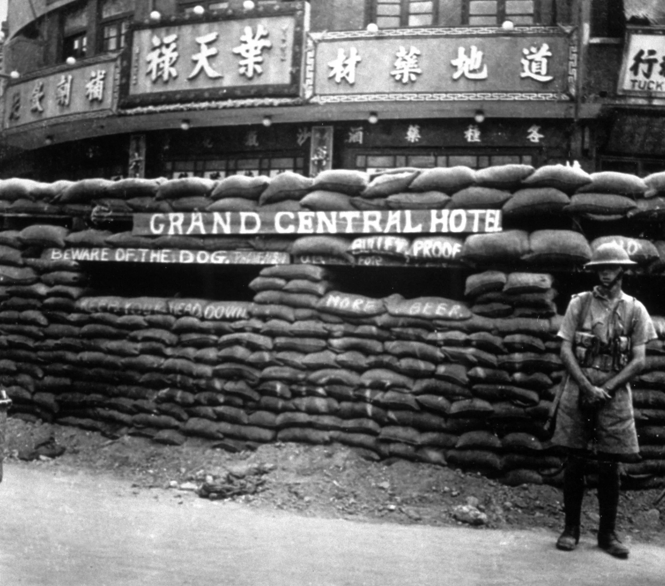 A British soldier standing near the North Station, Chapei (Chinese territory Shanghai) during the Sino-Japanese conflict, circa 1935. They named their dugouts and sandbag emplacements in a style reminiscent of the 1914-1918 war in France. (Photo by Hulton Archive/Getty Images)