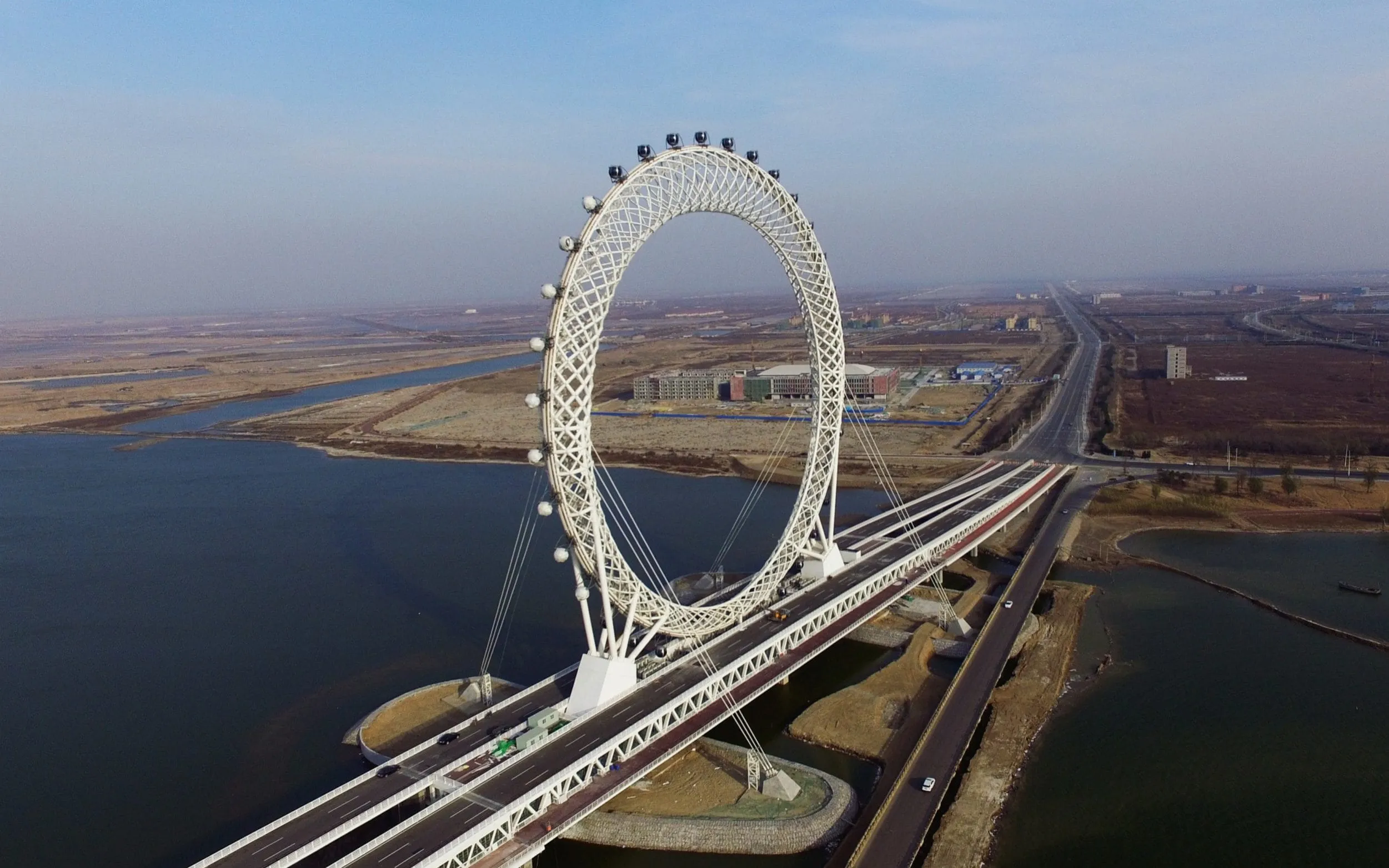 Bailang River Bridge Ferris Wheel is under construction on November 27, 2017 in Weifang, Shandong Province of China. The ferris wheel over Bailang River measures 145 metres tall with 36 carts that can carry 10 passengers each. The wheel is 125 meters in diameter and features a grid design. Constructed by Tianjin Craftsman Manufacture, the wheel is ten metres taller than the world famous London Eye, and boasts Wi-Fi on-board. (Photo by VCG/VCG via Getty Images)