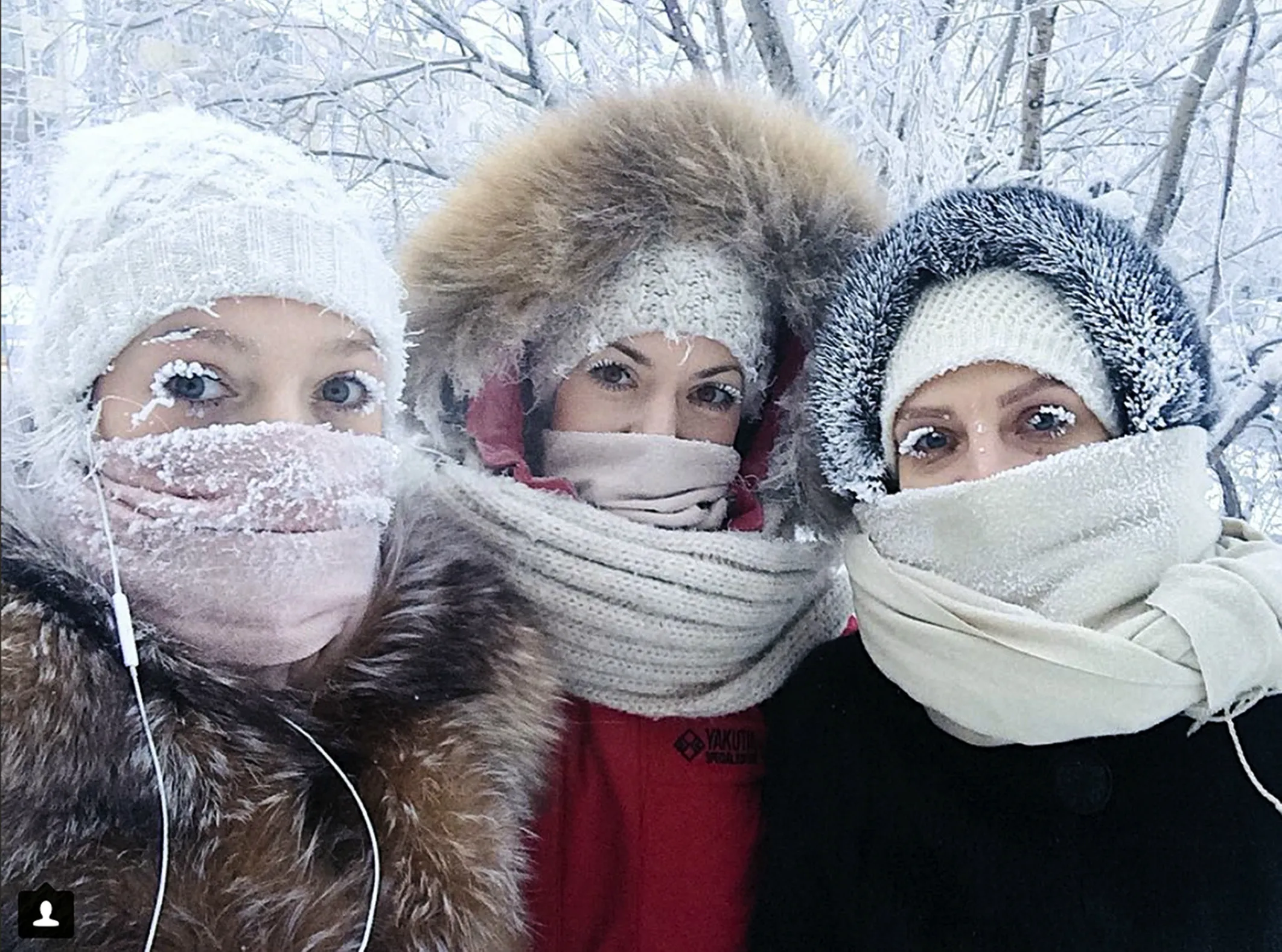 In this photo taken on Sunday, January 14, 2018, Anastasia Gruzdeva, left, poses for selfie with her friends as the temperature dropped to about –50 degrees (–58 degrees Fahrenheit) in Yakutsk, Russia. Temperatures in the remote, diamond-rich Russian region of Yakutia have dropped to near-record lows, plunging to –67 degrees Centigrade (-88.6 degrees Fahrenheit) in some areas. (Photo by Sakhalife.ru Photo via AP Photo)