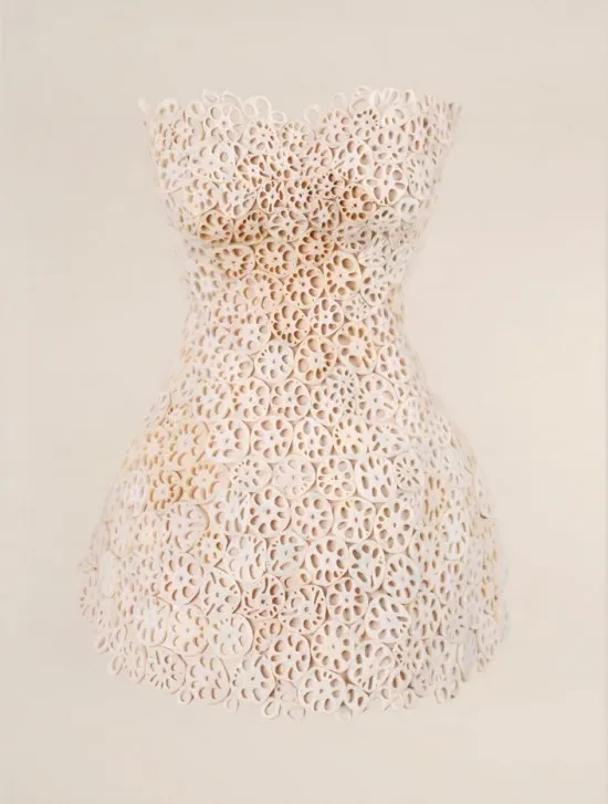 The color, texture and shape of food has inspired a collection of artists and fashion designers to create clothing inspired by culinary creations. Hunger Pains Food Fashion is a project photographed by Ted Sabarese and created by a team of 15 designers led by Ami Goodheart. Two Project Runway alums, Daniel Feld and Wesley Nault, wove the artichoke dress shown above. The model stood for six hours while the duo crafted the dress leaf by leaf before the first photograph was taken.