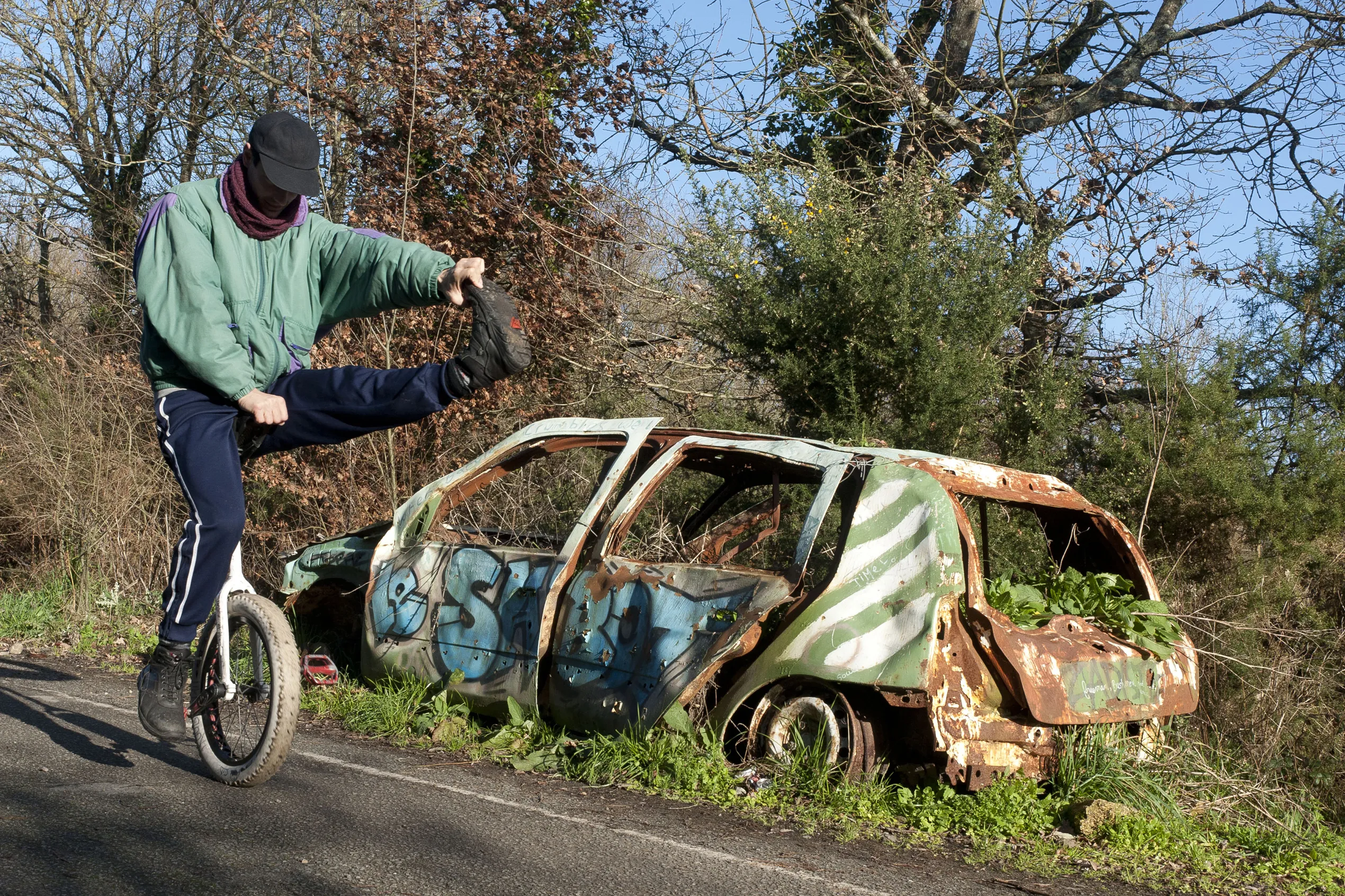 An activist on a unicycle rides past an abandoned car that could be used as a barricade in the “ZAD” (zone to defend), in Notre-Dame-des-Landes, outside the city of Nantes, western France, Wednesday, January 17, 2018. French Prime Minister Edouard Philippe says that the government has decided against building an airport in western France that has mobilized nearly a decade of sometimes violent protests and he told protesters occupying the site that they must leave. (Photo by Mathieu Pattier/AP Photo)