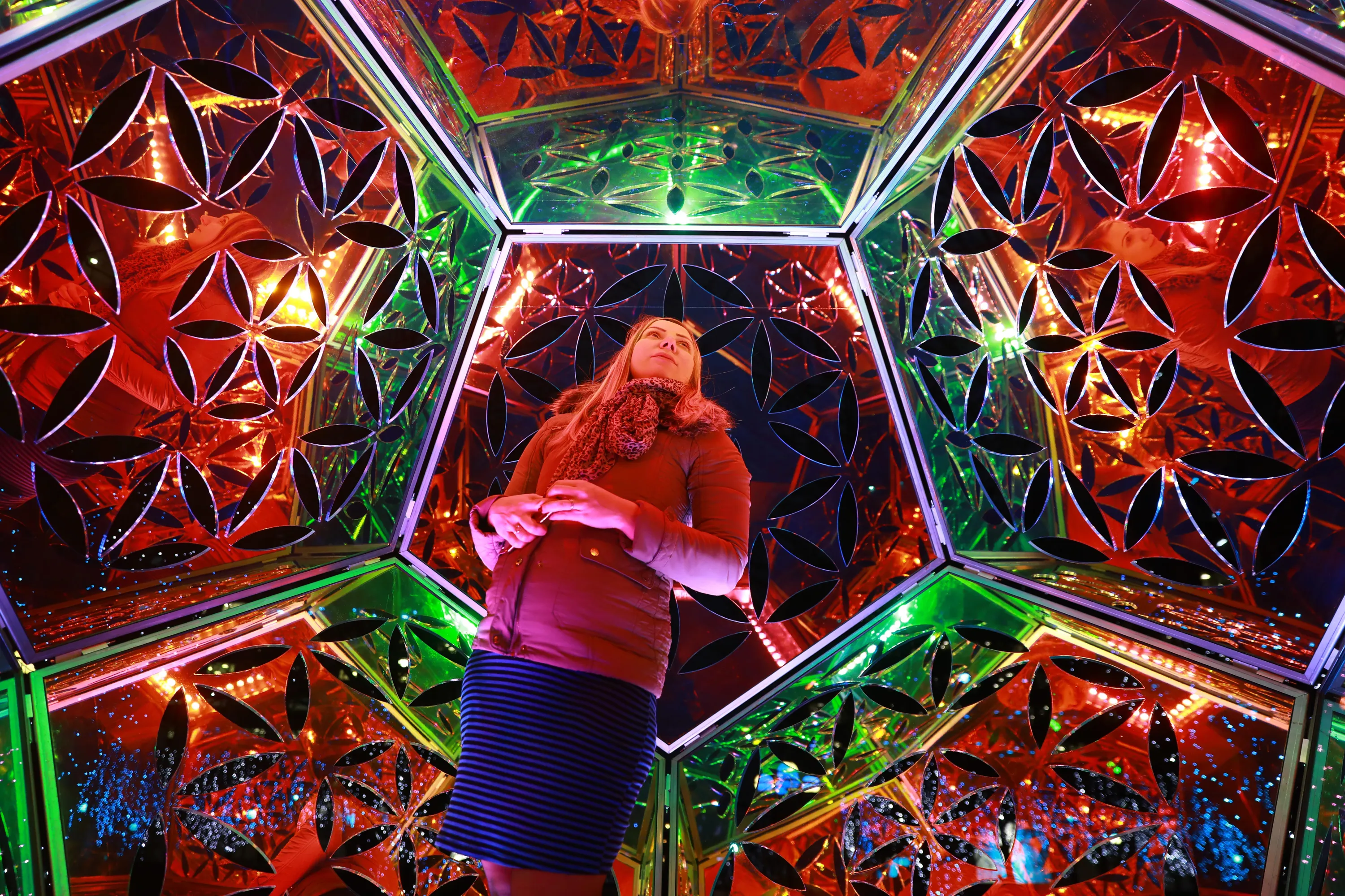 A woman interacts with art installation Dazzling Dodecahedron at the Winter Lights festival at Canary Wharf in East London, Britain, 16 January 2018. The art exhibition runs from 16 to 27 of January across sites at Canary Wharf. (Photo by Neil Hall/EPA/EFE)