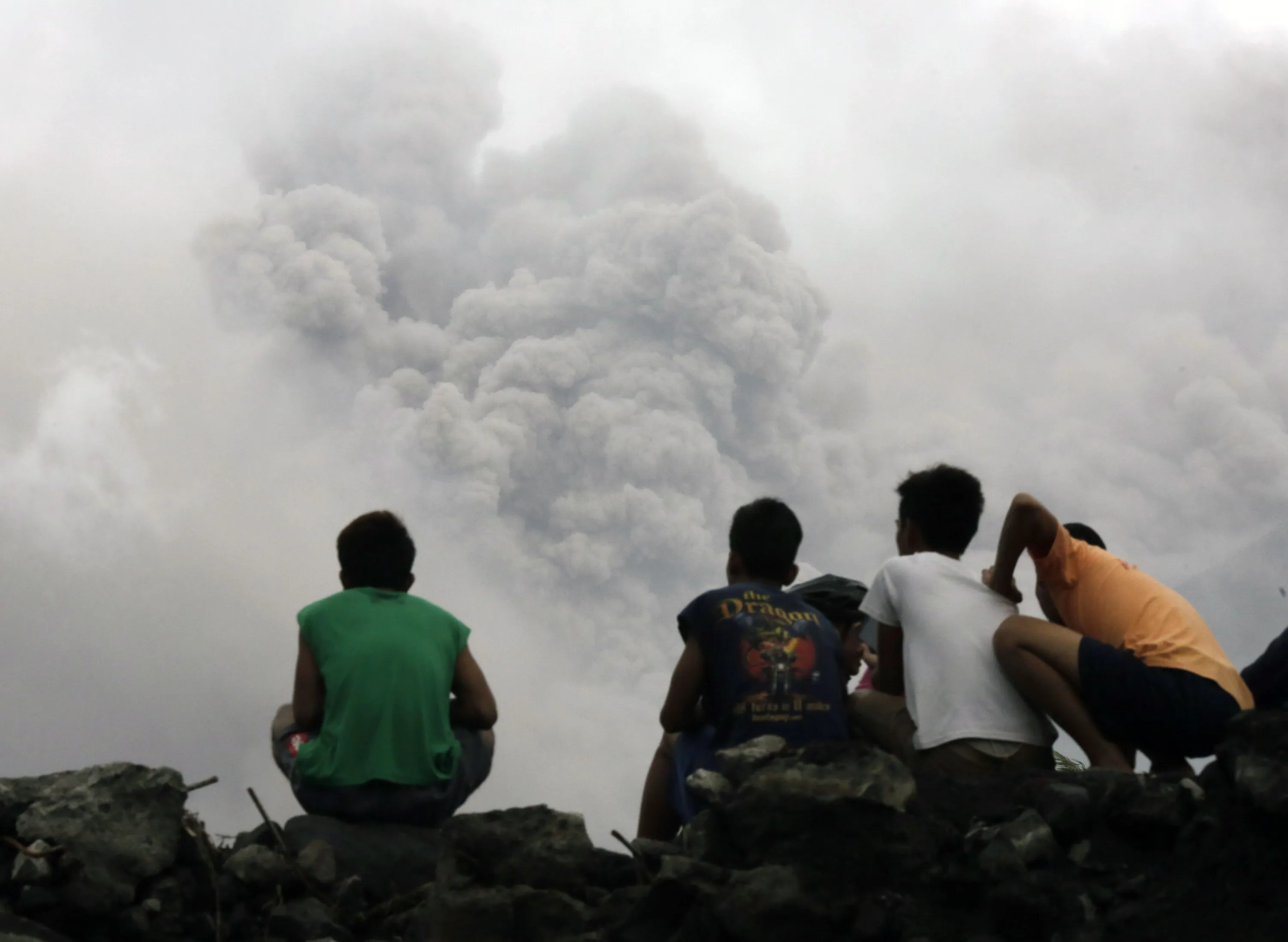 Filipino villagers sit along the slopes of rumbling Mayon Volcano as it spews ash in Legaspi city, Albay province, Philippines, January 16,2018. (Photo by Francis R. Malasig/EPA/EFE/Rex Features/Shutterstock)
