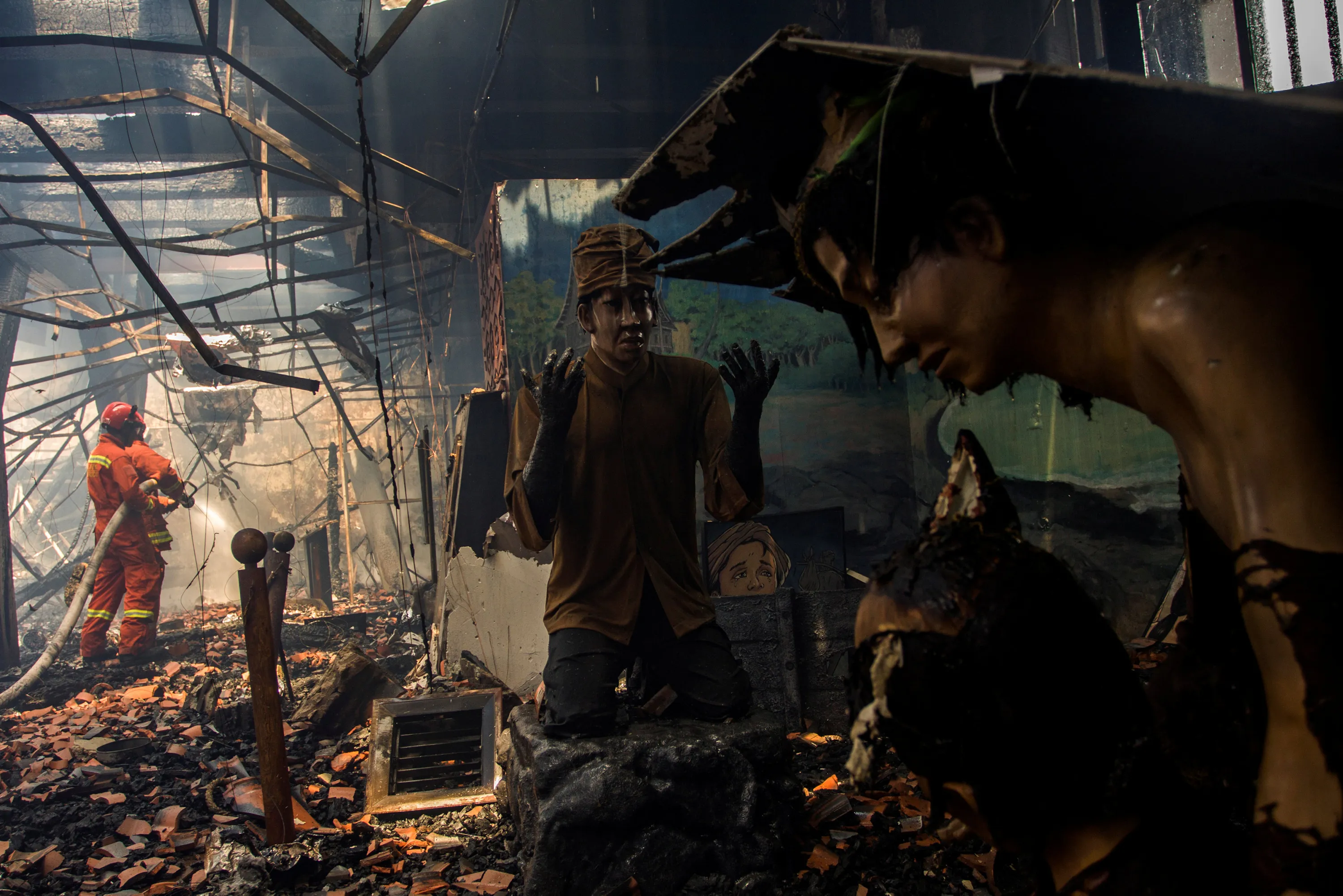 A firefighter uses an extinguisher at the Bahari Museum following a fire, in Jakarta, Indonesia January 16, 2018 in this photo taken by Antara Foto. (Photo by Galih Pradipta/Reuters/Antara Foto)