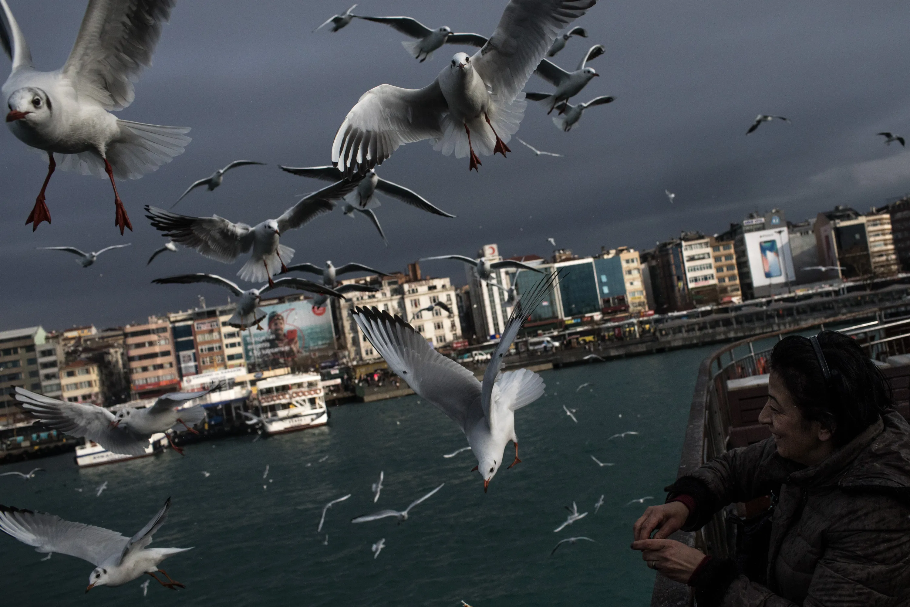 A woman feeds seagulls from a ferry crossing the Bosphorus on January 16, 2018 in Istanbul, Turkey. (Photo by Chris McGrath/Getty Images)