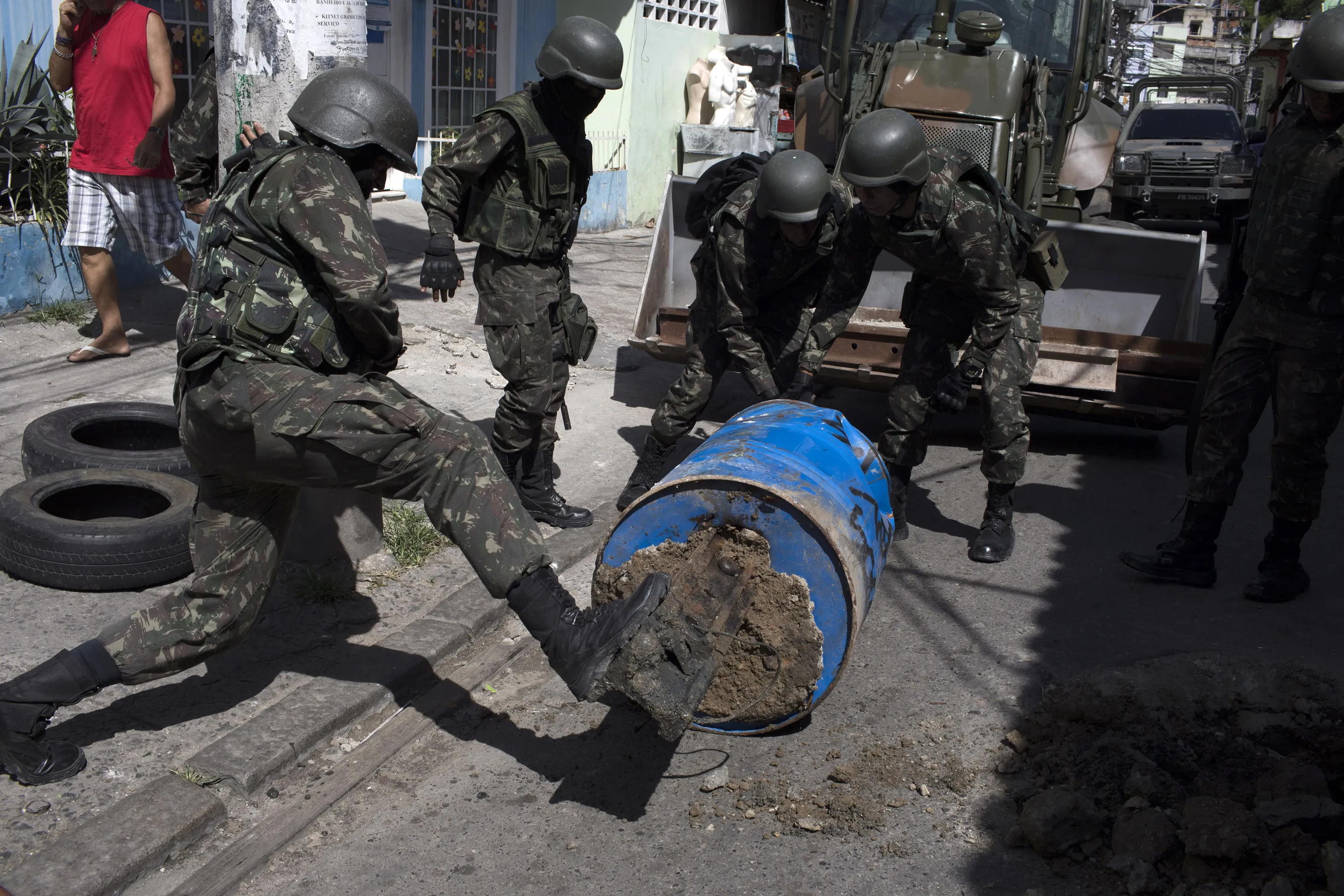 Soldiers remove a barricade during a surprise operation in Jacarezinho slum in Rio de Janeiro, Brazil, Thursday, January 18, 2018. (Photo by Leo Correa/AP Photo)