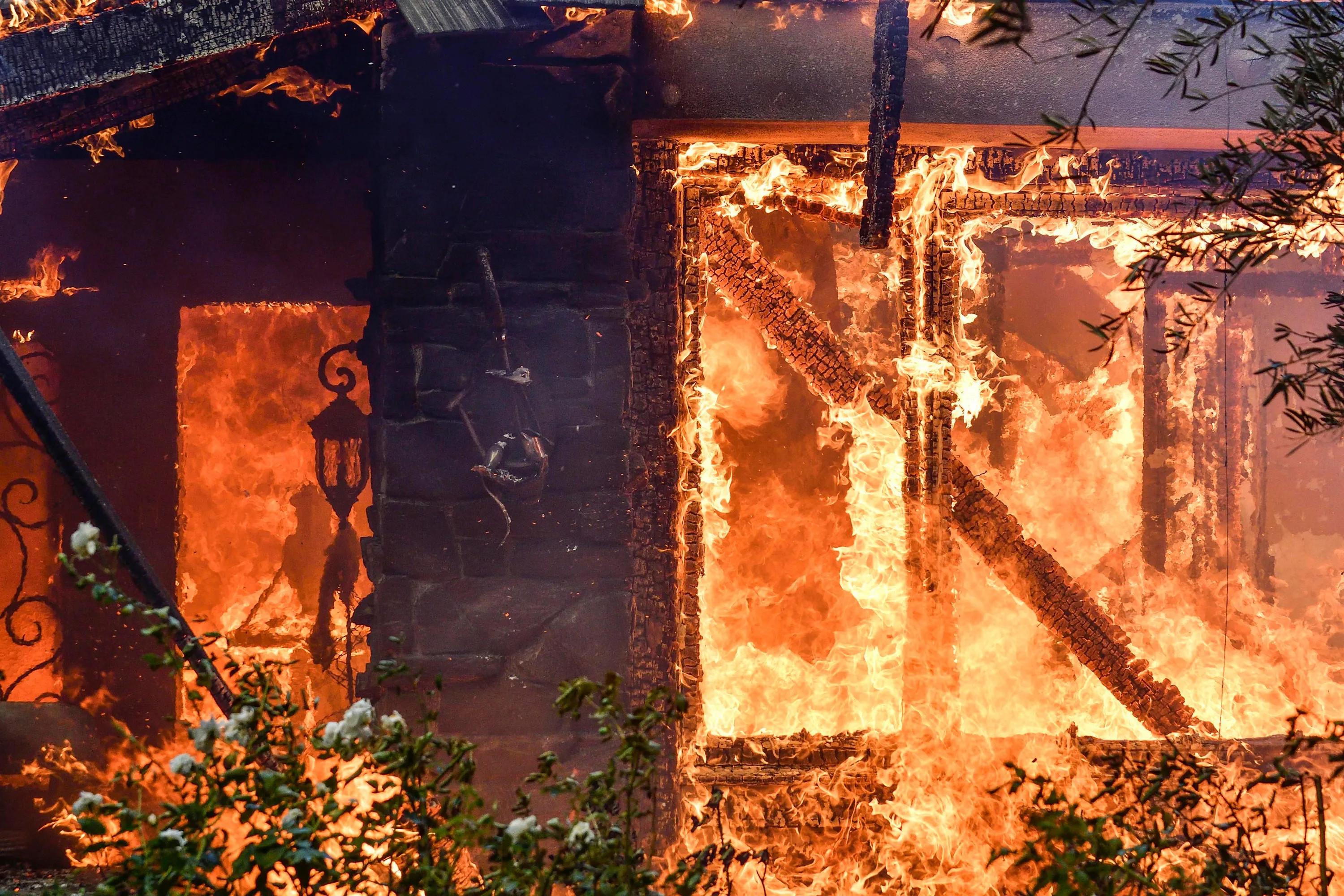 Flames from a wildfire consume a home in Anaheim Hills, Calif., Monday, October 9, 2017. Wildfires whipped by powerful winds swept through Northern California sending residents on a headlong flight to safety through smoke and flames as homes burned. (Photo by Jeff Gritchen/The Orange County Register via AP Photo)