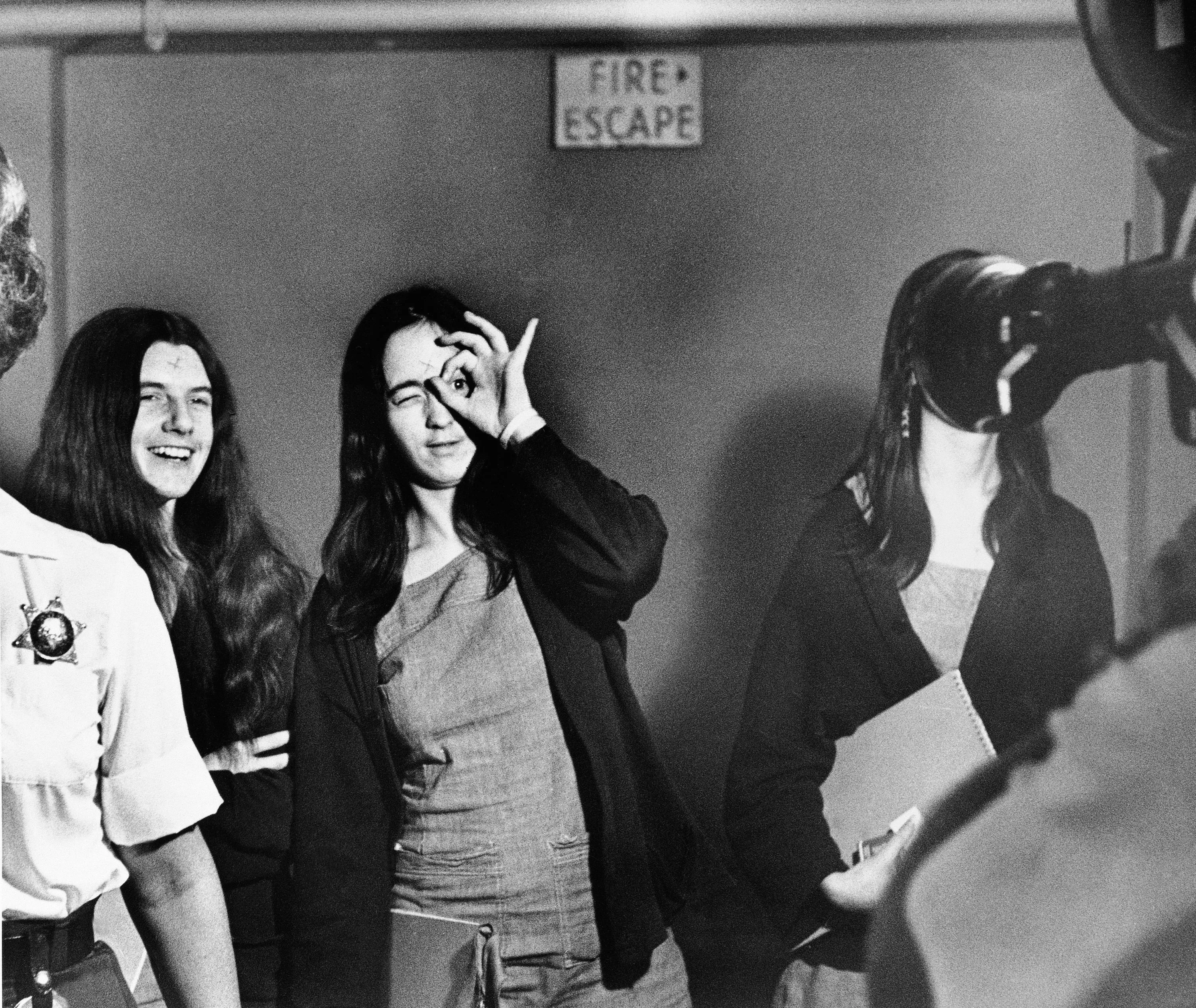 Susan Denise Atkins, defendant in the Tate murder trial, mimics a television film cameraman while on her way to court in Los Angeles with fellow defendants Patricia Krenwinkel, left, and Leslie Van Houten, hidden by the camera lens, September 22, 1970. (Photo by AP Photo)