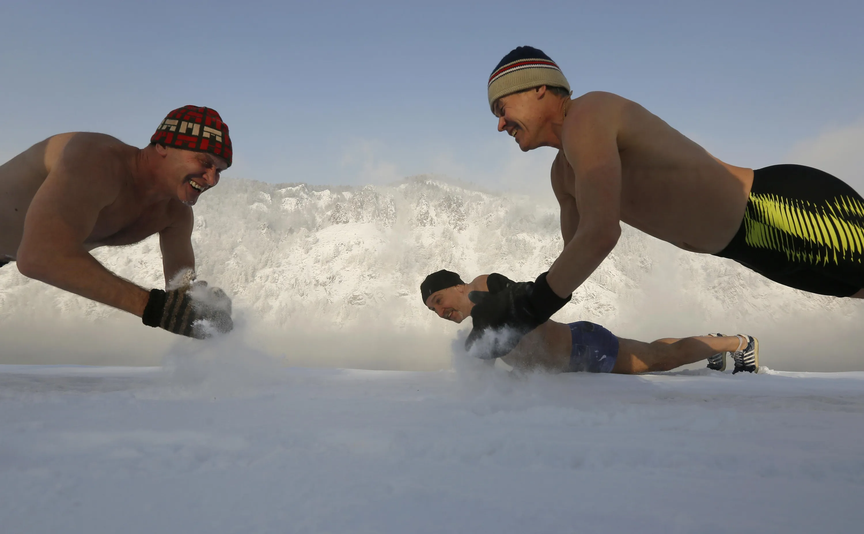 Members of the Dolphin winter swimming club warm up on the bank of the Yenisei River ahead of their weekly bathing session, with the air temperature at about minus 31 degrees Celsius (minus 23.8 degrees Fahrenheit), in the Siberian town of Divnogorsk, Russia January 26, 2018. (Photo by Ilya Naymushin/Reuters)