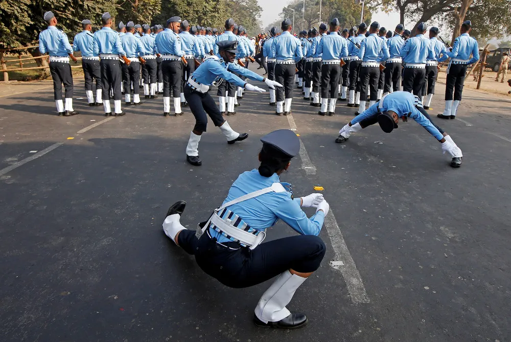 Indian Air Force officers stretch before taking part in full dress rehearsal for India's Republic Day parade in Kolkata, January 23, 2018. (Photo by Rupak De Chowdhuri/Reuters)
