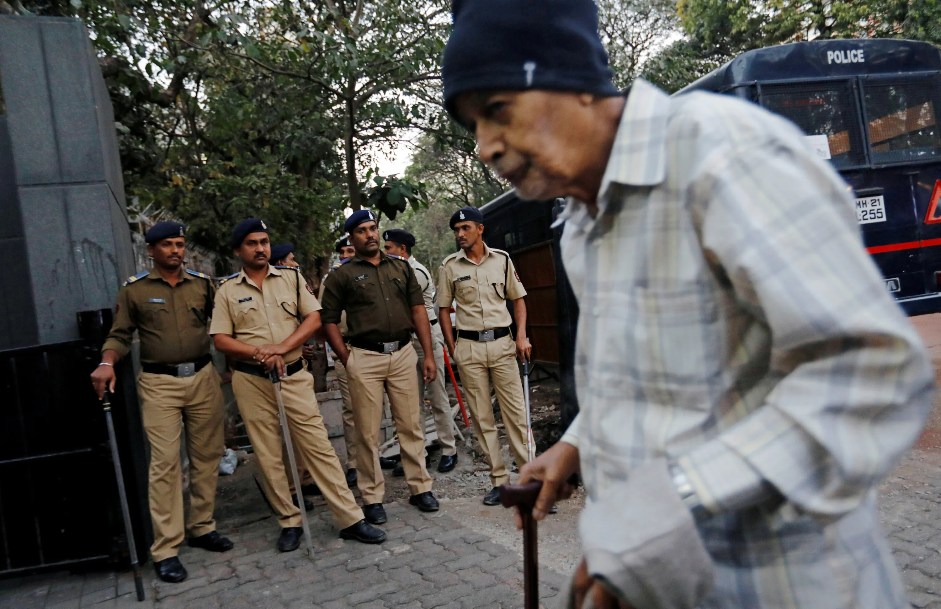 Policemen stand guard as a cinema goer arrives to watch Bollywood movie “Padmaavat” at a theater in Mumbai, India January 24, 2018. A controversial Indian movie that has angered Hindu extremists finally opens on January 25 amid heightened security owing to fears of widespread riots. Police are on high alert across several states after protesters pledged to disrupt the release of “Padmaavat”, a Bollywood epic about a mythical Hindu queen. (Photo by Danish Siddiqui/Reuters)