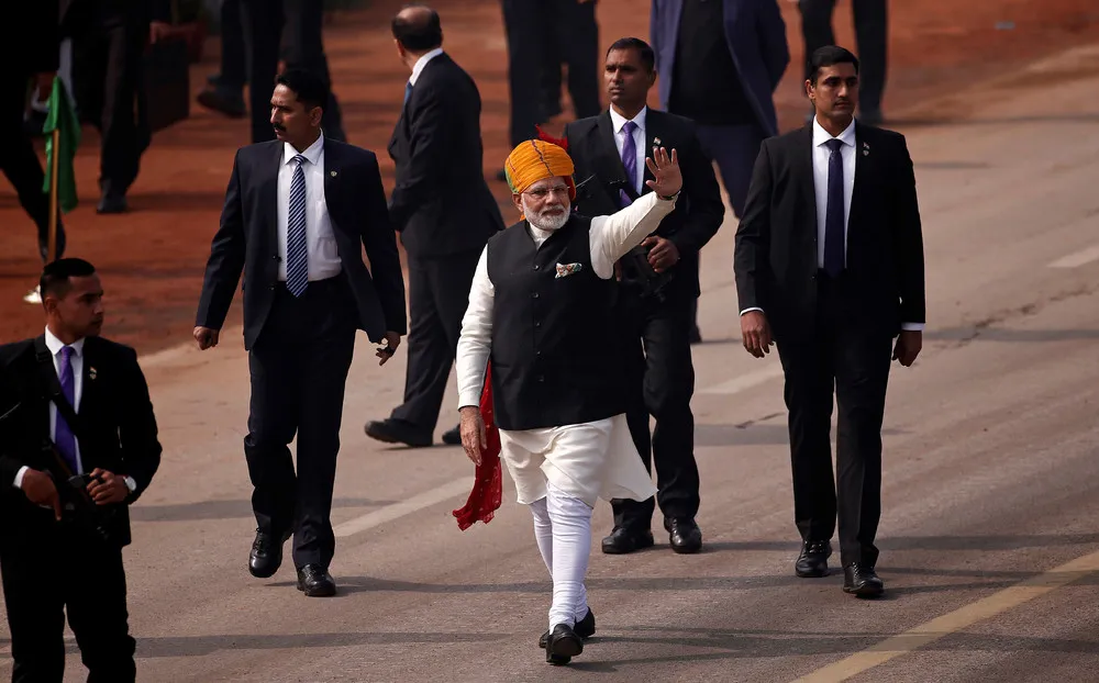 Prime Minister Narendra Modi waves towards the crowd as he leaves after attending the Republic Day parade in New Delhi, India January 26, 2018. (Photo by Adnan Abidi/Reuters)