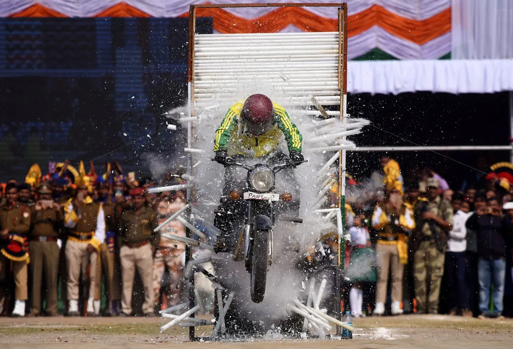 An Assamese policeman performs a stunt on his motorcycle during the Republic Day parade in Guwahati, India January 26, 2018. (Photo by Anuwar Hazarika/Reuters)