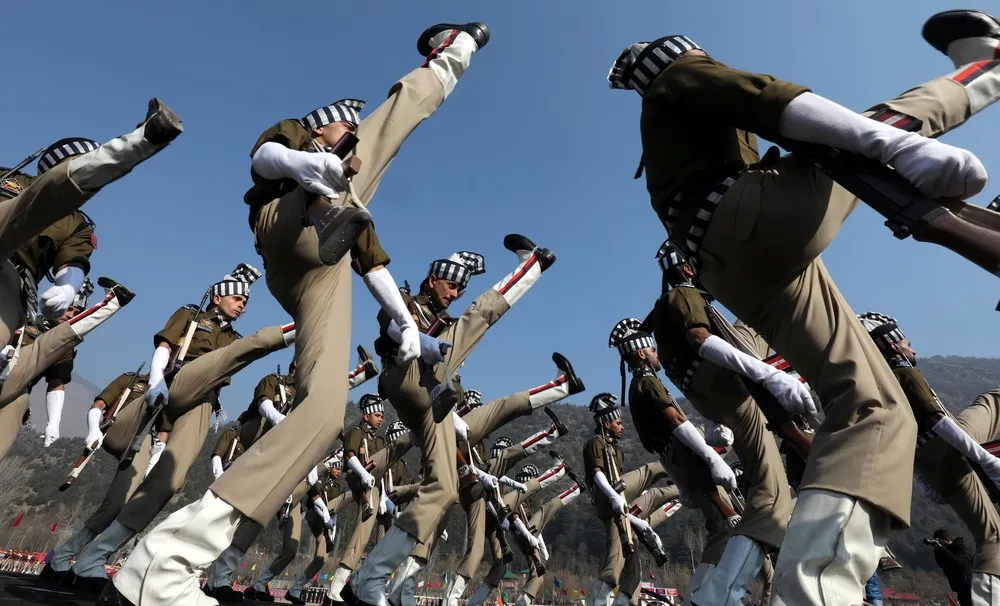 New recruits of Jammu and Kashmir policemen march during their passing out parade at a training centre in Sheeri, Baramulla, some 65 kilometers north of Srinagar, the summer capital of Indian Kashmir, 21 January 2018. At least 471 new police recruits completed their training course and are ready to discharge their professional duties. (Photo by Farooq Khan/EPA/EFE/Rex Features/Shutterstock)