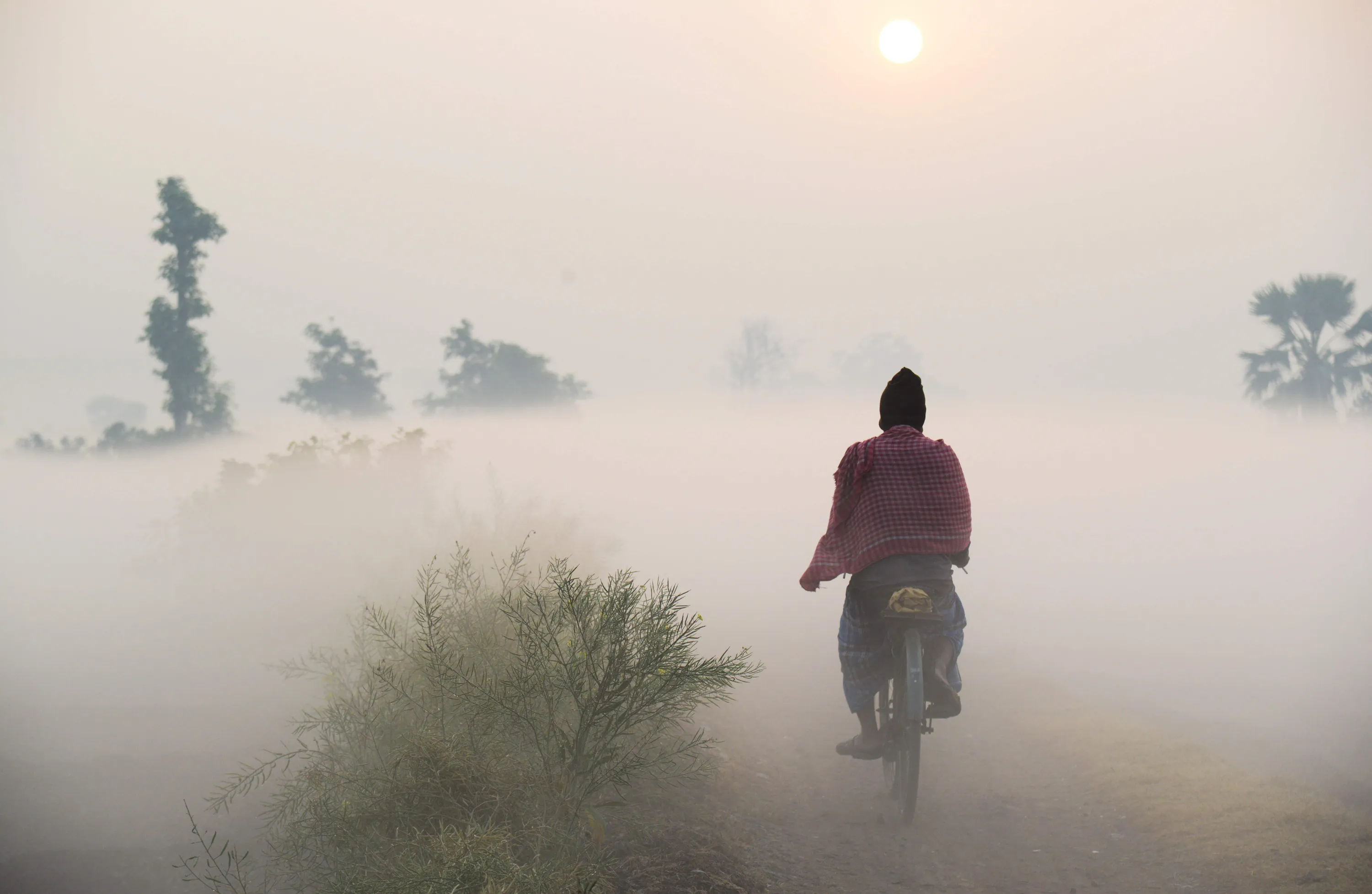 An Indian labourer rides a bike through agricultural land to work in the fields during a cold foggy morning in Kolkata on January 21, 2018. (Photo by Dibyangshu Sarkar/AFP Photo)