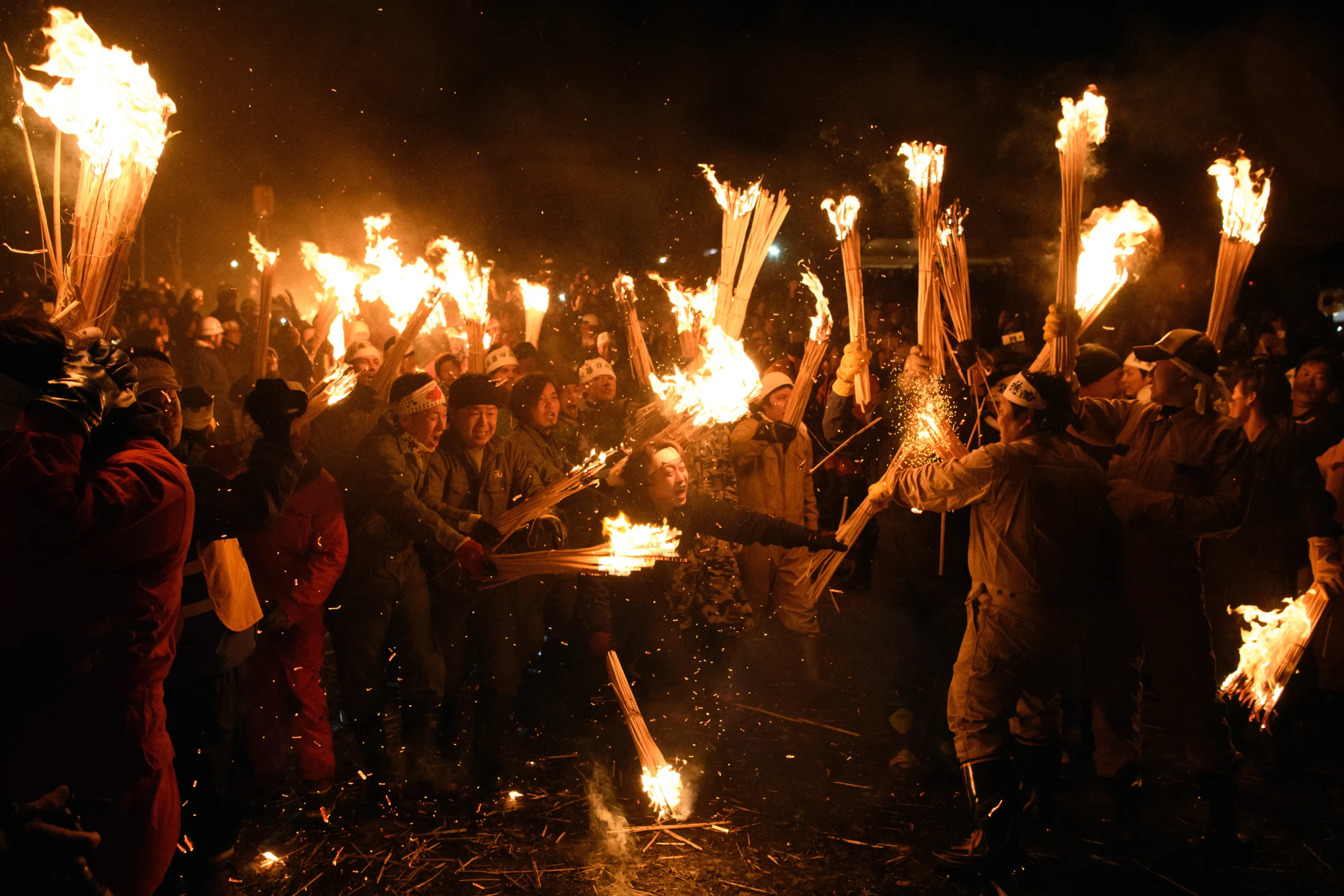 People rush forward with flaming sticks as they try to set fire to a wooden shrine that is protected by men from Nozawaonsen village during the Nozawaonsen Dosojin Fire Festival on January 15, 2018 in Nozawaonsen, Japan. The festival is staged by village men of “yakudoshi¨ or “unlucky” ages of 42 and 25 to celebrate the birth of a family's first child, to chase away evil spirits, and to pray for a happy marriage. It takes the form of fire battle between the men who build the shrine, who try to protect it, and the other villagers who try to set it aflame by throwing torches at the shrine. (Photo by Carl Court/Getty Images)