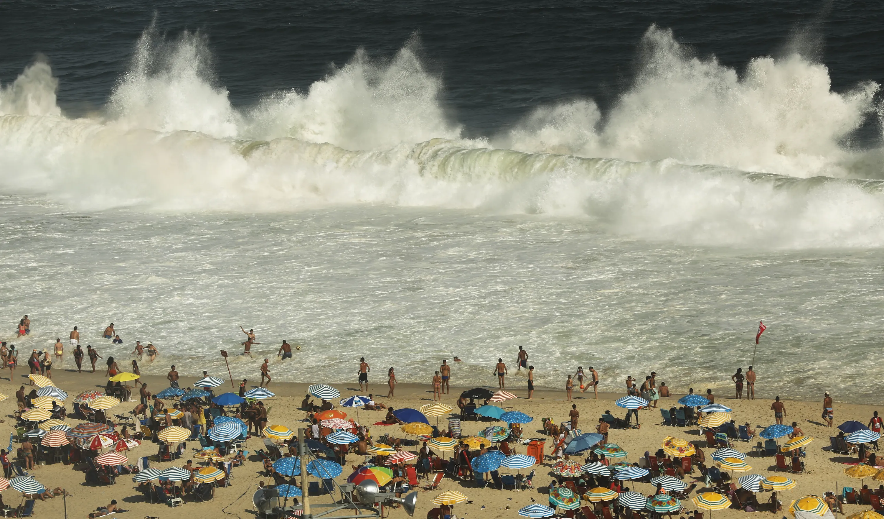 Waves break as people gather on Copacabana beach on January 28, 2018 in Rio de Janeiro, Brazil. According to researchers from the Chinese Academy of Sciences, 2017 was the warmest year recorded in Earth's oceans. Researchers noted a “long-term warming trend driven by human activities”. (Photo by Mario Tama/Getty Images)