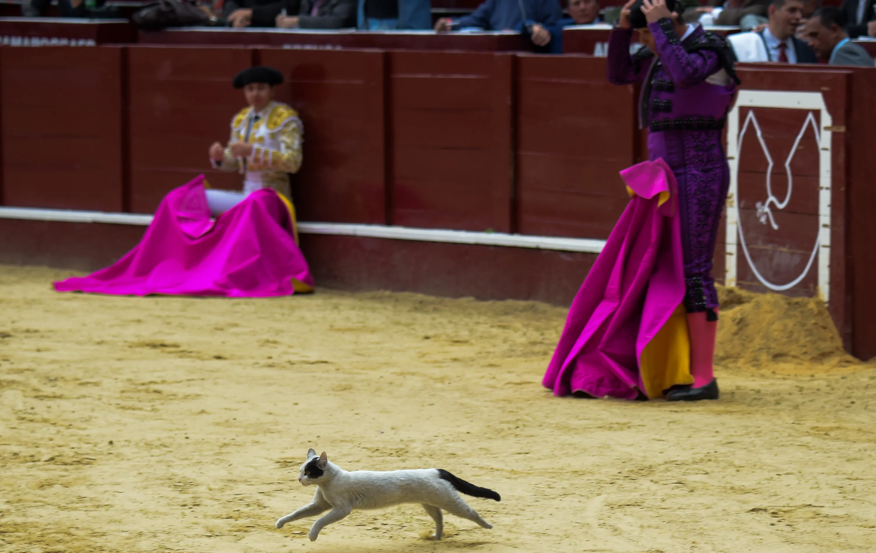 A cat is seen during a bullfight at the La Santamaria bullring in Bogota, Colombia, on January 28, 2018. (Photo by Raul Arboleda/AFP Photo)