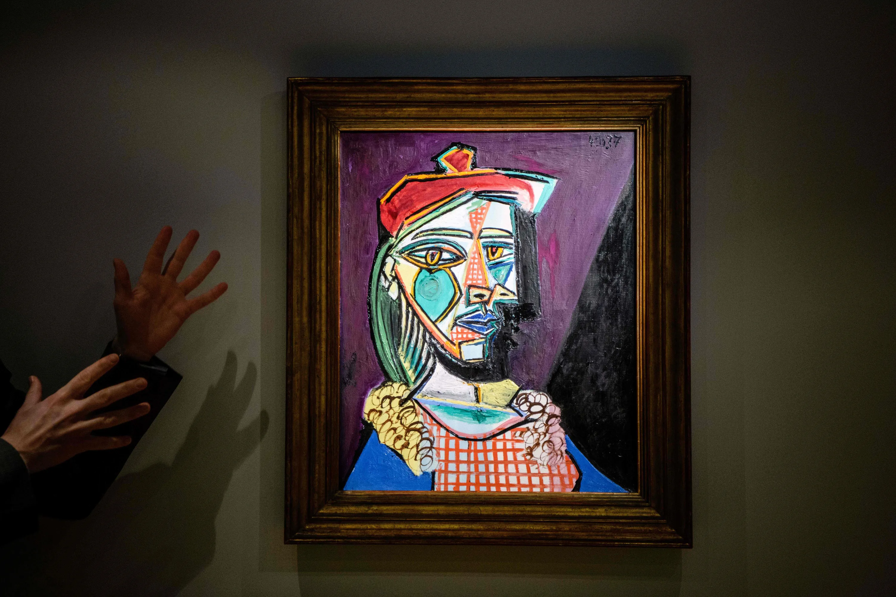 James Mackie (L), Sotheby' s senior director and head of the Department Impressionist and Modern Art, introduces Pablo Picasso' s 1937 oil painting “Femme au béret et à la robe quadrillée (Marie- Thérèse Walter)” during a media preview at the Sotheby' s showroom in Hong Kong on January 30, 2018. (Photo by Anthony Wallace/AFP Photo)