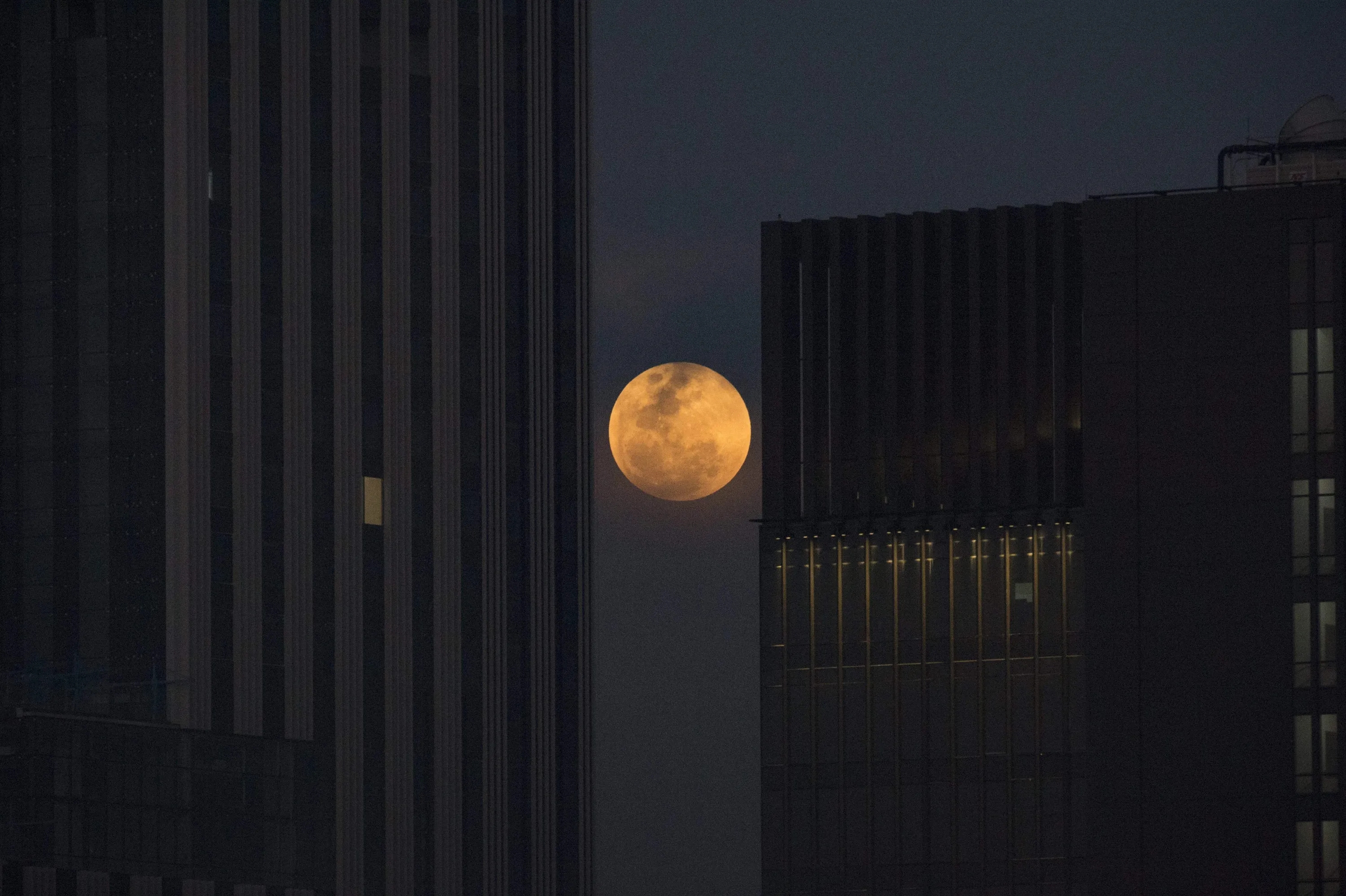 The moon rises between two office buildings in Bangkok on January 31, 2018. (Photo by Lillian Sunwanrumpha/AFP Photo)