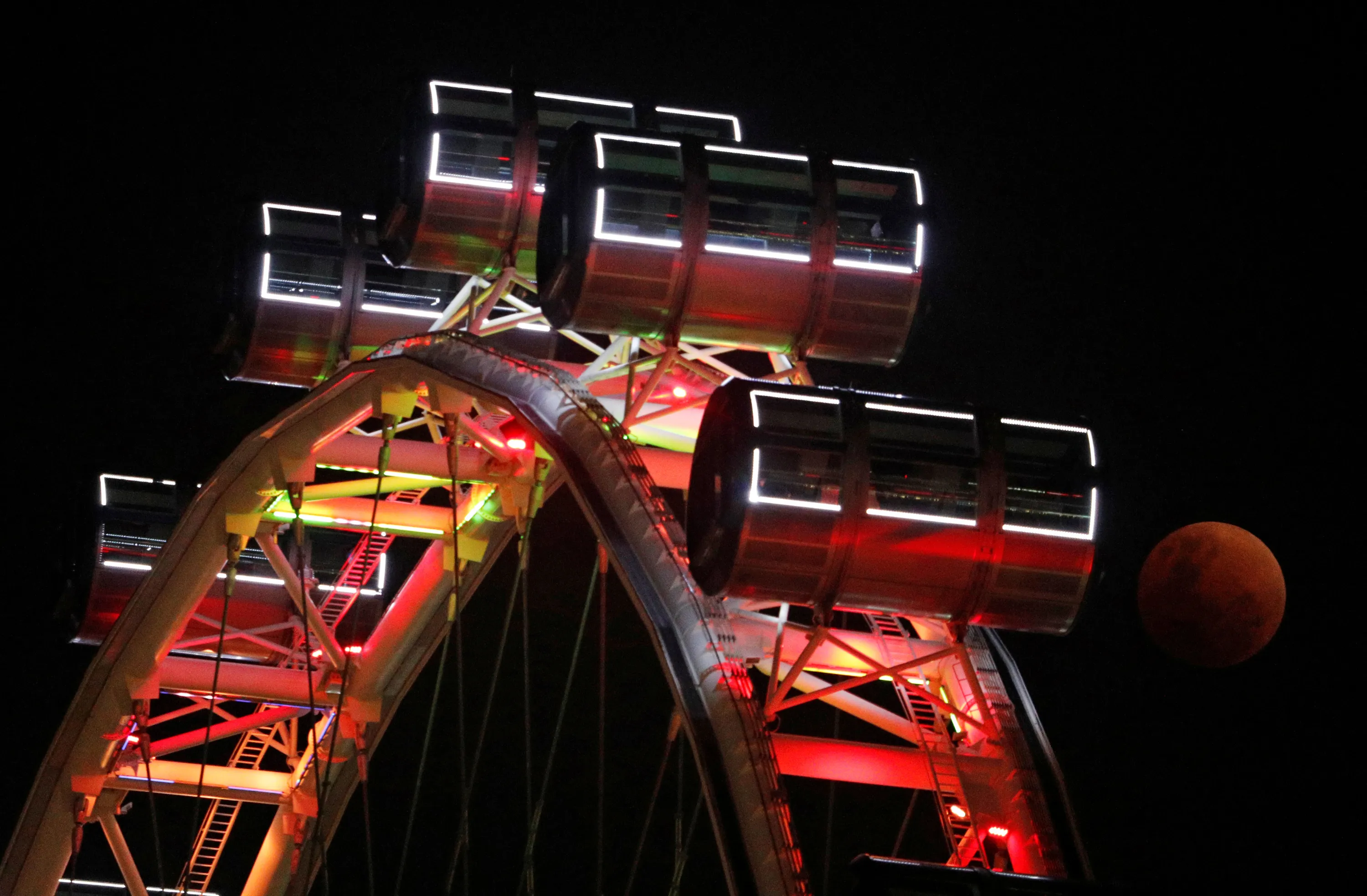 The moon is seen during an eclipse, next to the Singapore Flyer observation wheel in Singapore, January 31, 2018. (Photo by Edgar Su/Reuters)