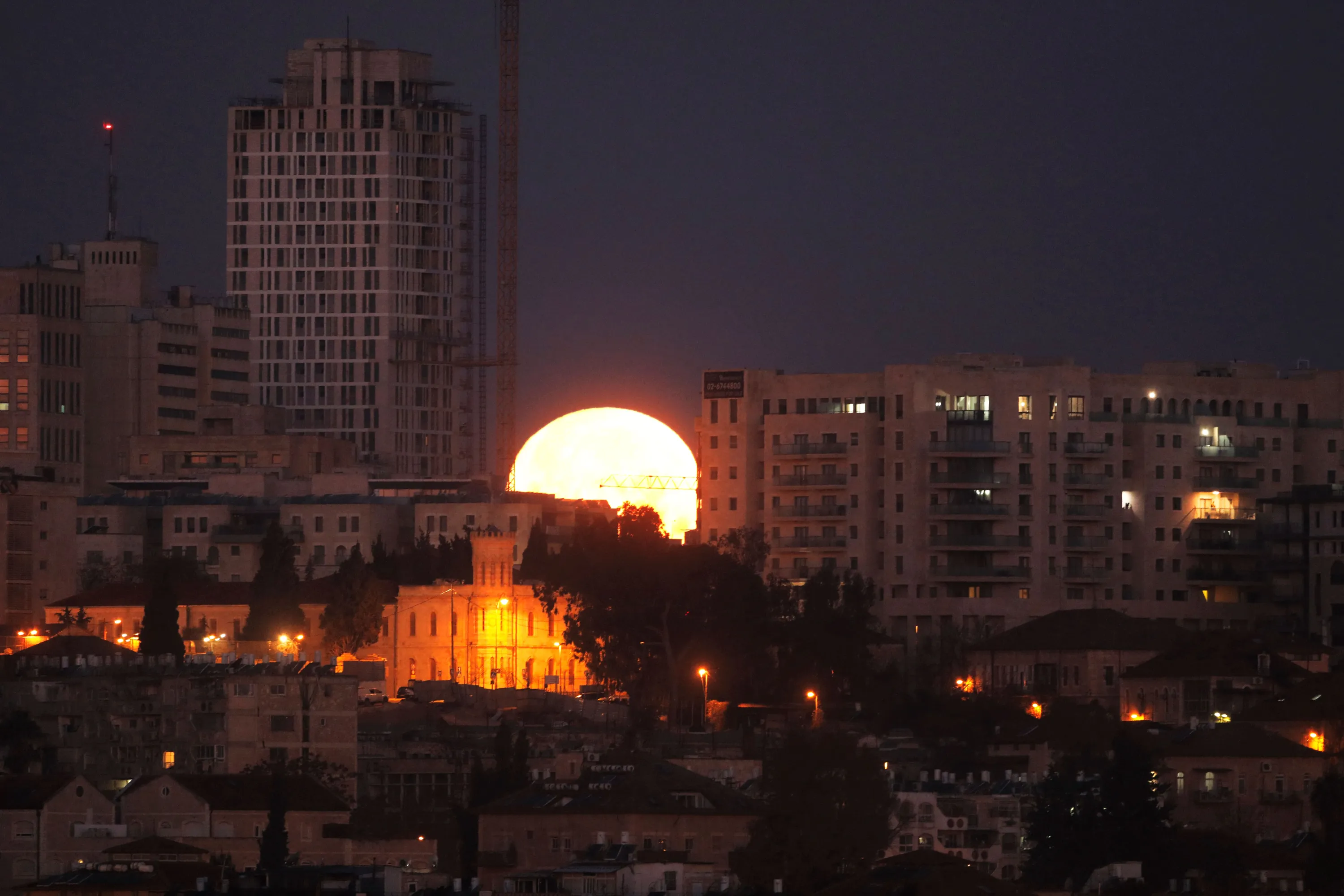 The moon sets behind the city of Jerusalem early on January 31, 2018. (Photo by Menahem Kahana/AFP Photo)