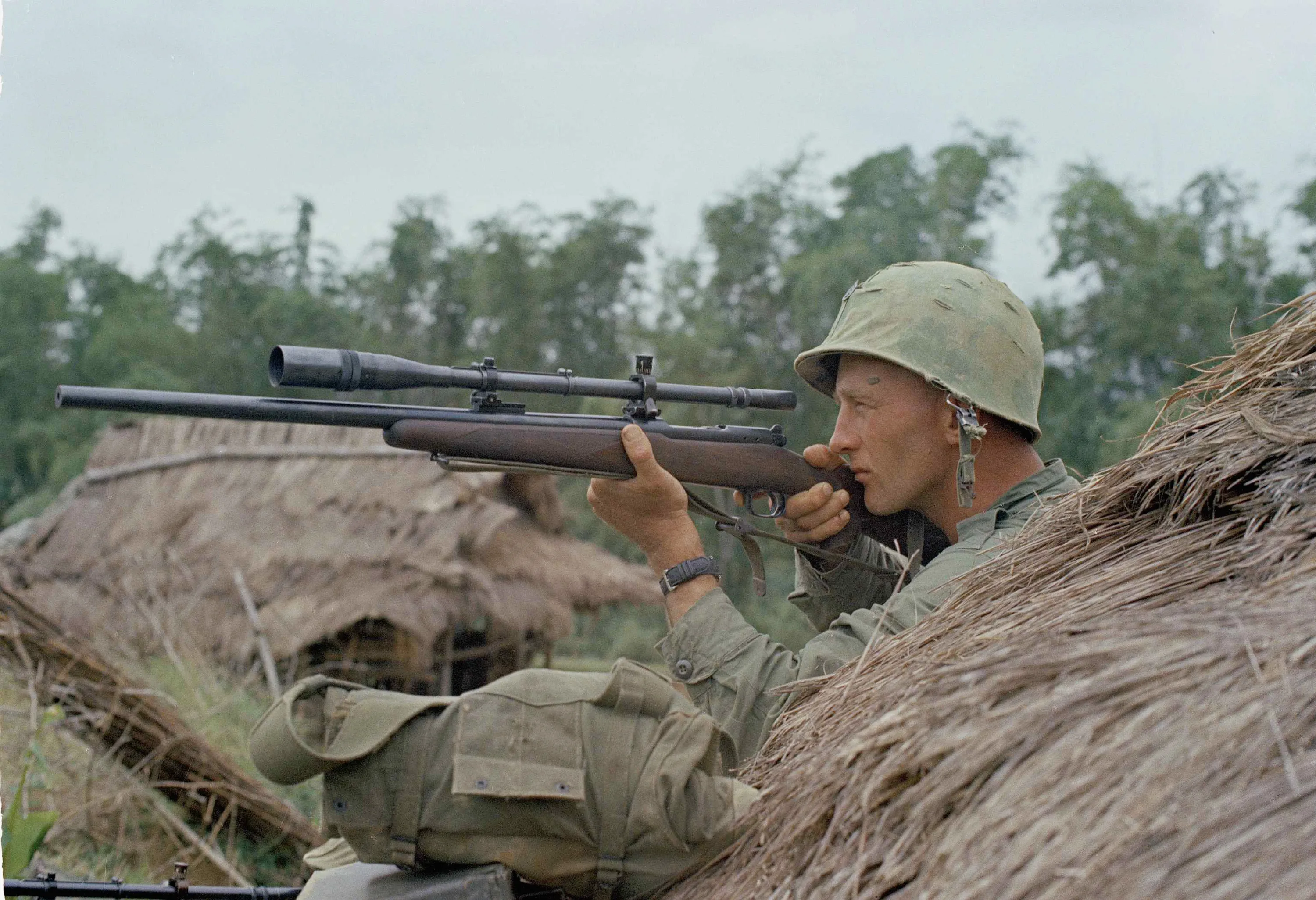A U.S. Marine sniper seeks out Viet Cong with a high-powered rifle and scope near Que Son, Vietnam, December 13, 1965. (Photo by AP Photo)
