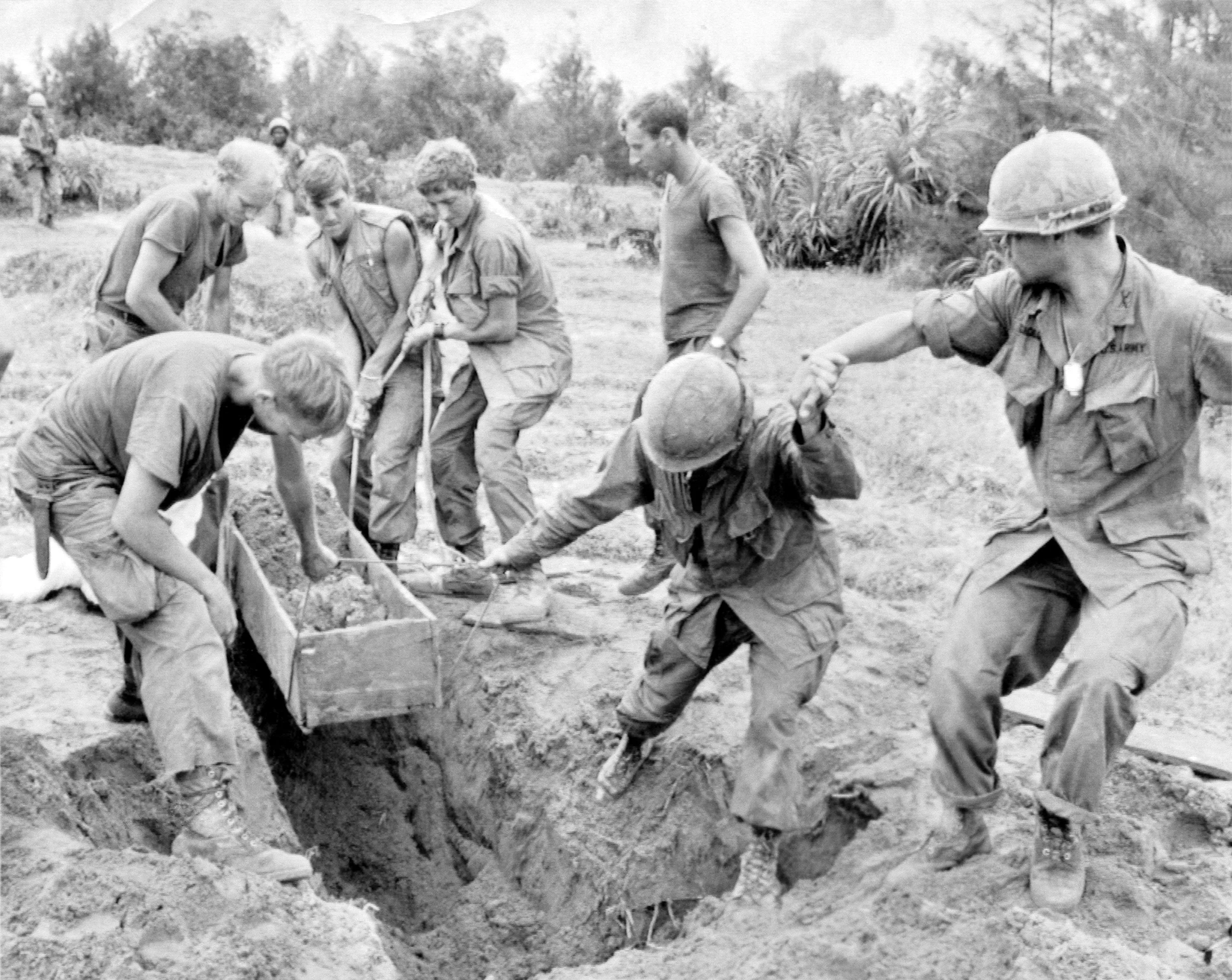 American troops pull a sand covered wooden box, in which enemy weapons were hidden, from a large hole in the Batangan Peninsular, 60 miles south of Danang, South Vietnam, on January 24, 1969. (Photo by AP Photo)