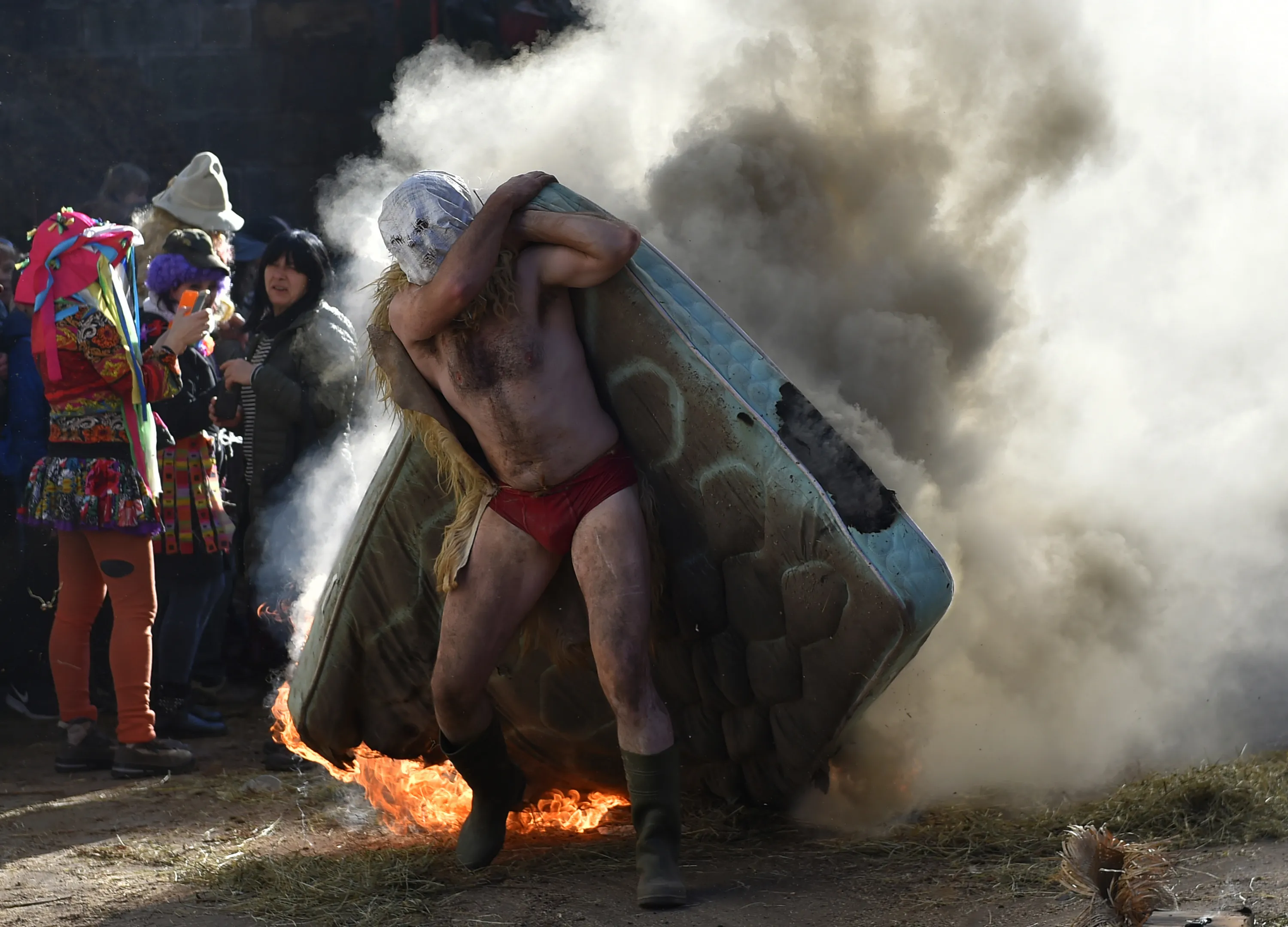 A masked participant carries a burning matress during the ancient carnival of Zubieta, in the northern Spanish Navarra province on January 30, 2018. The yearly three day festivities, revolving mainly around agriculture and principally sheep hearding, run on the last Sunday, Monday and Tuesday of January where Navarra Valley locals from two villages dress up and participate in a variety of activites as they perform a pilgrimage through each village. (Photo by Ander Gillenea/AFP Photo)