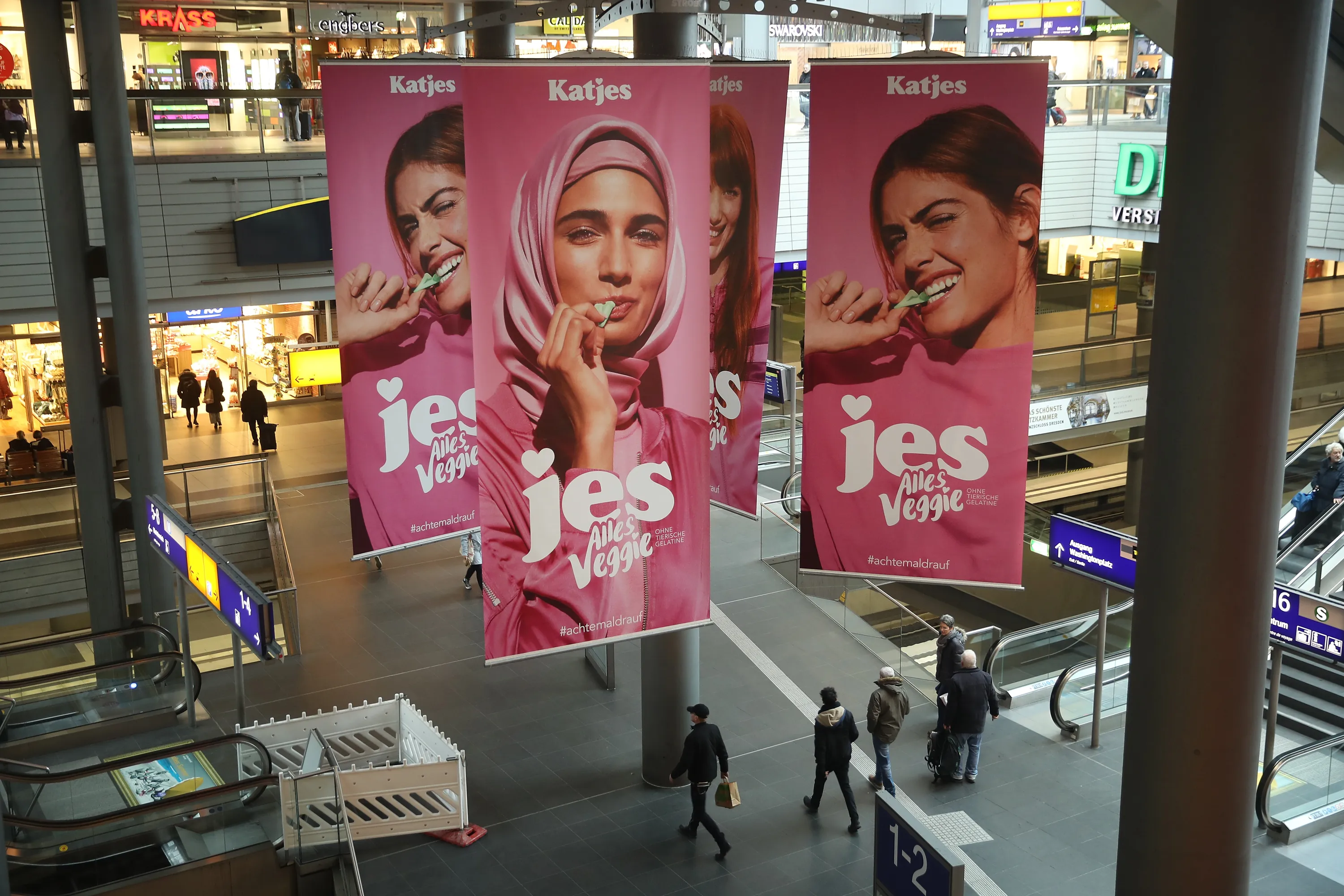 Advertisements for a new line of vegetarian sweets by German candymaker Katjes feature a Muslim woman wearing a headscarf and three non-covered women at Hauptbahnhof railway station on January 31, 2018 in Berlin, Germany. The campaign, which also has video clips that are running online, has provoked indignant protest on social media by critics charging the campaign promotes suppression of women's rights and encourages the “Islamization” of Germany. Germany's AfD right-wing political party has risen to political prominence largely by successfully appealing to Germans who fear the presence of Muslim refugees and immigrants. (Photo by Sean Gallup/Getty Images)