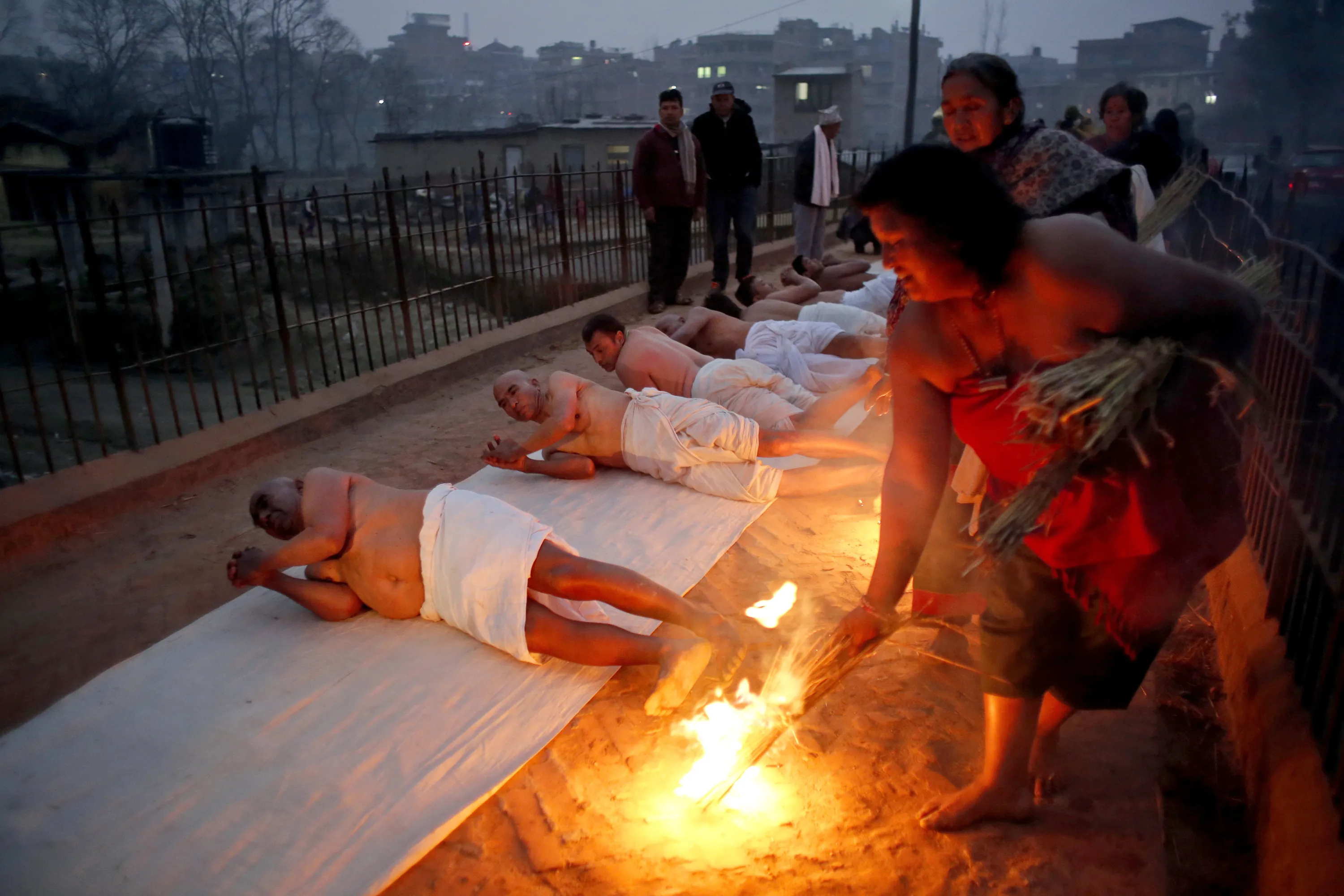 Nepalese Hindu devotees roll on the ground on the banks of Hanumante River on the last day of Madhav Narayan festival in Bhaktapur, Nepal, Wednesday, January 31, 2018. During the festival, devotees recite holy scriptures dedicated to Hindu goddess Swasthani and Lord Shiva. Unmarried women pray to get a good husband while those married pray for the longevity of their husbands by observing a month-long fast. (Photo by Niranjan Shrestha/AP Photo)