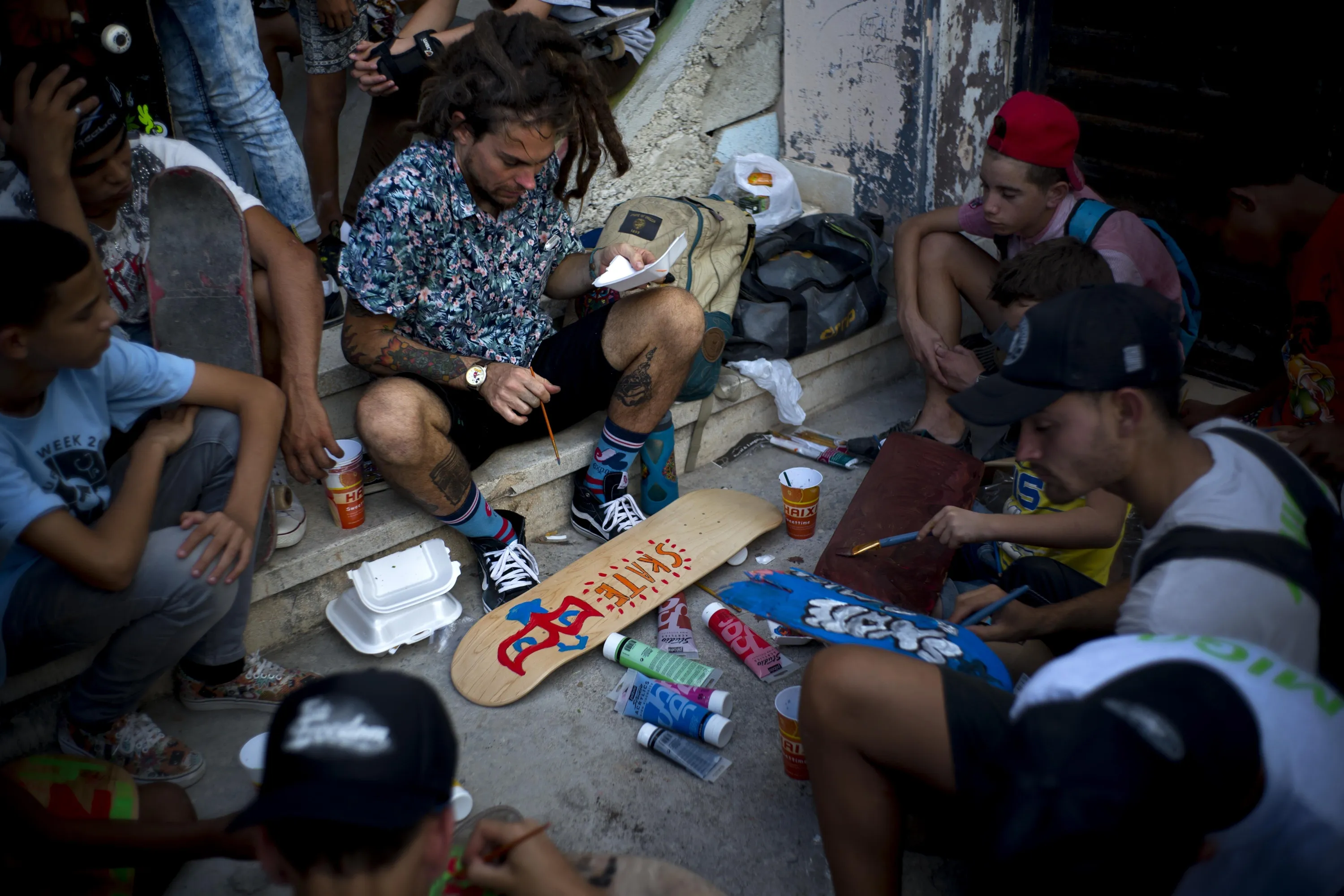 In this January 11, 2018 photo, Canadian skater Chris Dyer paints a skateboard inside an abandoned gym that was converted into a recreational space for skateboarders, the day of its inauguration inside the Educational complex Ciudad Libertad, a former military barracks that the late Fidel Castro turned into a school complex after the revolution in Havana, Cuba. For the skate park's grand opening, musicians performed short free concerts while young skaters got 60 newly donated skateboards and painted old ones. (Photo by Ramon Espinosa/AP Photo)