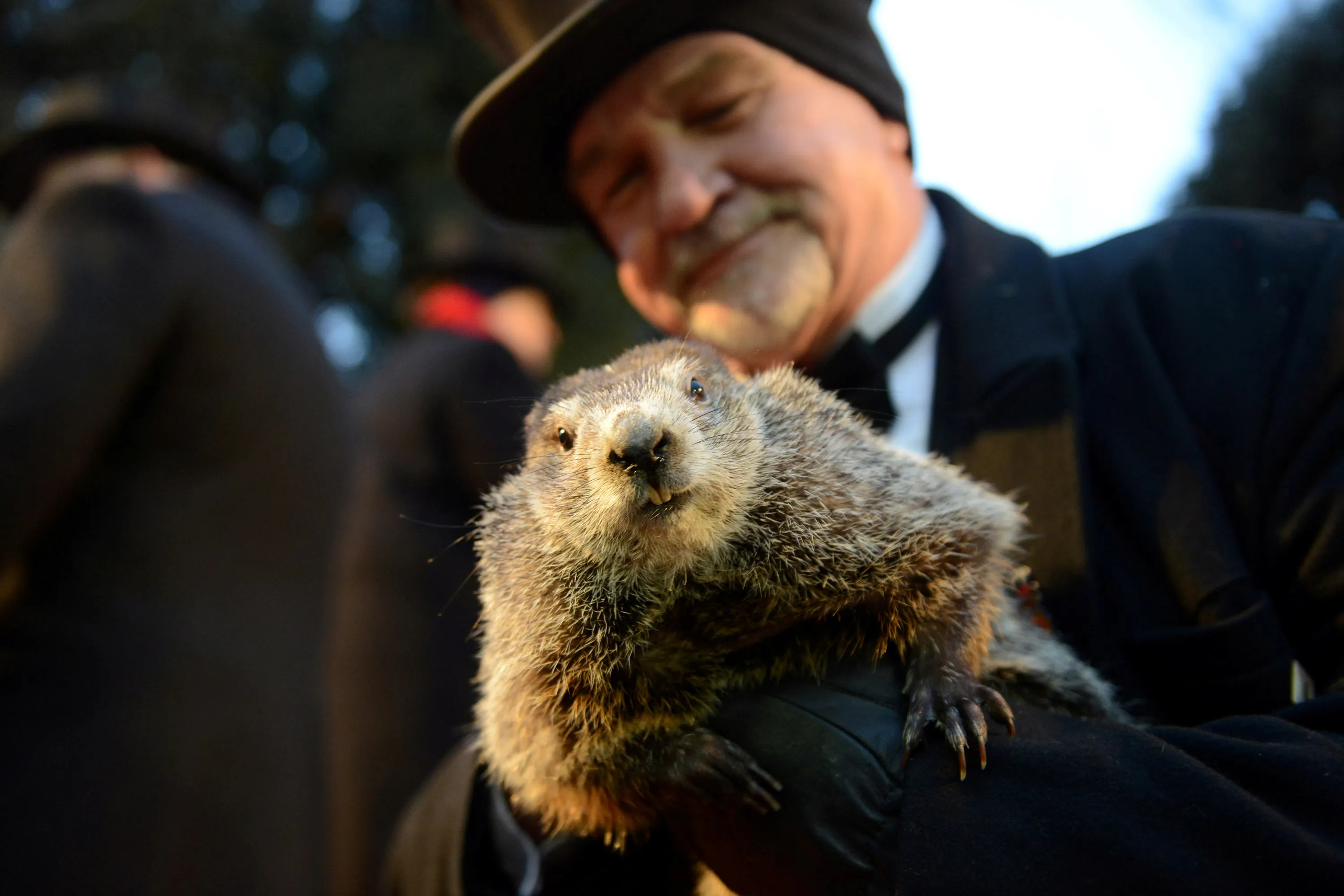 Co-handler John Griffiths holds Punxsutawney Phil for the crowd gathered at Gobbler's Knob on the 132nd Groundhog Day in Punxsutawney, Pa., February 2, 2018. Punxsutawney Phil, the weather-forecasting groundhog, emerged from his burrow in Pennsylvania on Friday, saw his shadow and predicted six more weeks of winter, despite his rival Staten Island Chuck in New York predicting an early spring. (Photo by Alan Freed/Reuters)