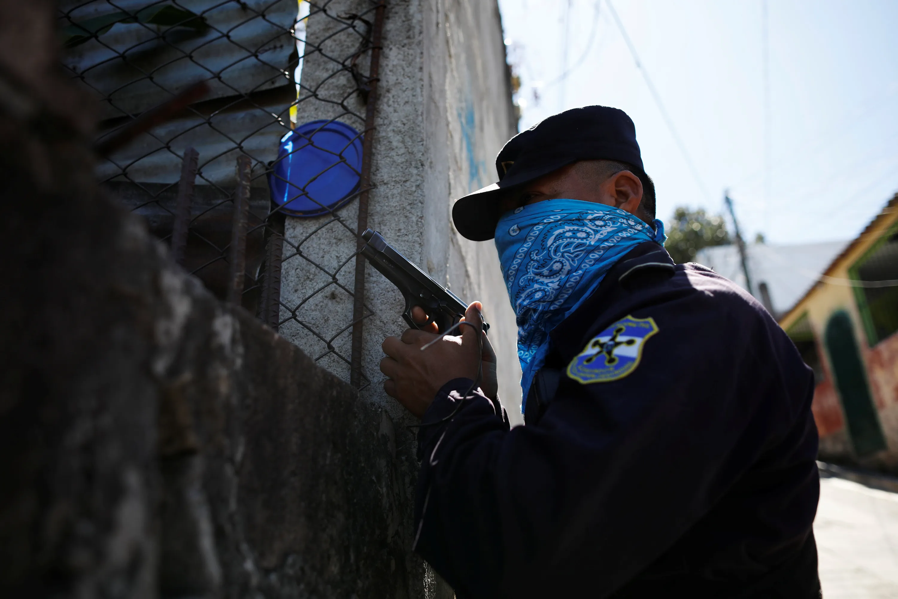 A Salvadoran policeman observes a search in a house in the area where according to local media, a policeman and two gang members were killed, in San Salvador, El Salvador, February 2, 2018. (Photo by Jose Cabezas/Reuters)