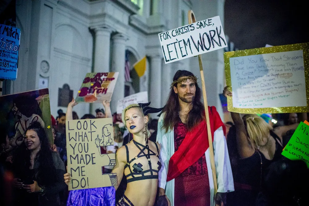 Strip club dancers, workers, and supporters march in in New Orleans on February 1, 2018, to protest the recent police raids that cited and closed several strip clubs on Bourbon Street. (Photo by Emily Kask/AFP Photo)