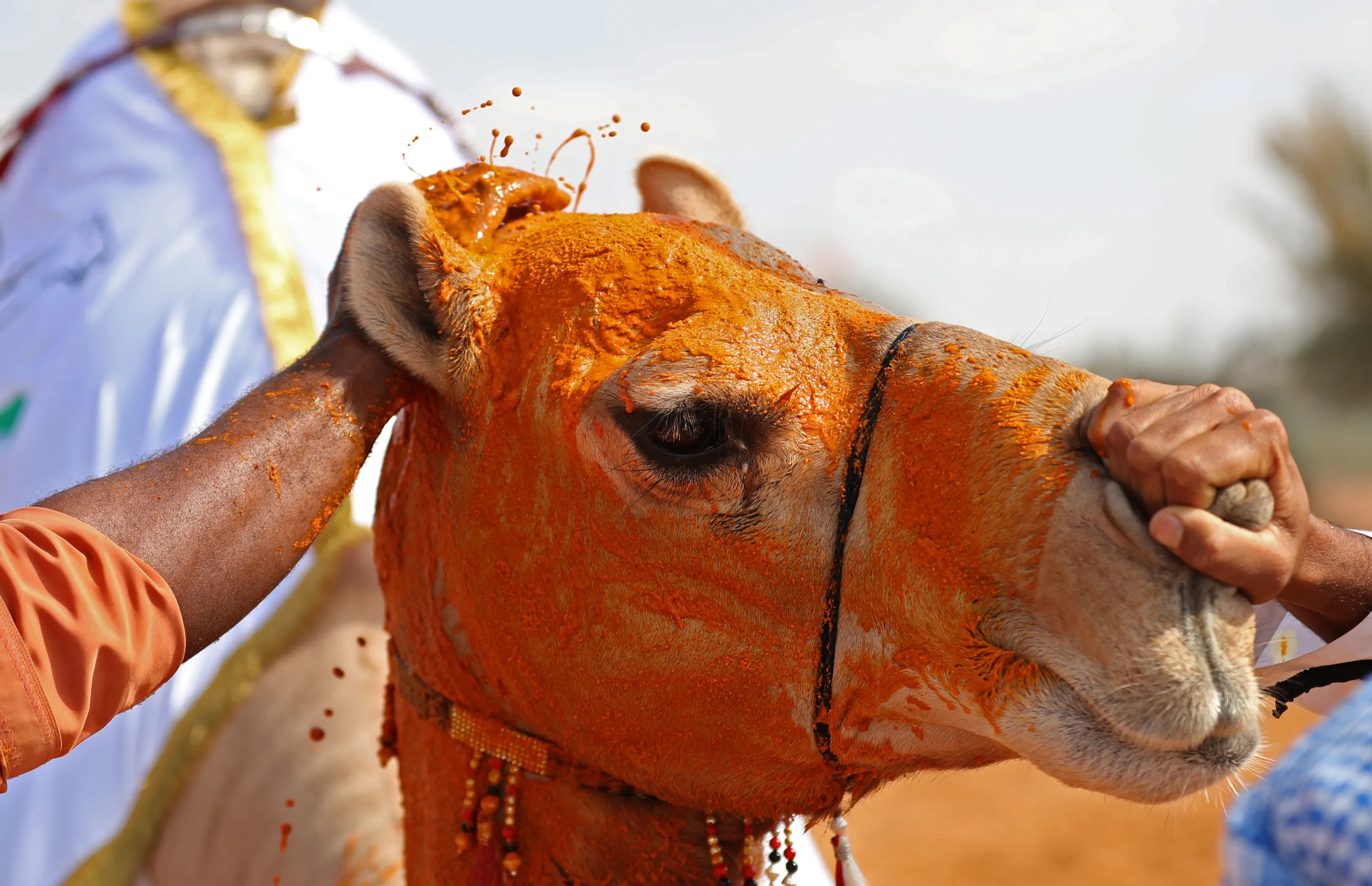 A camel that won a beauty context has its face covered with saffron during the Sheikh Sultan Bin Zayed al-Nahyan camel festival, at the Shweihan racecourse in al-Ain on the outskirts of Abu Dhabi on February 1, 2018. (Photo by Karim Sahib/AFP Photo)