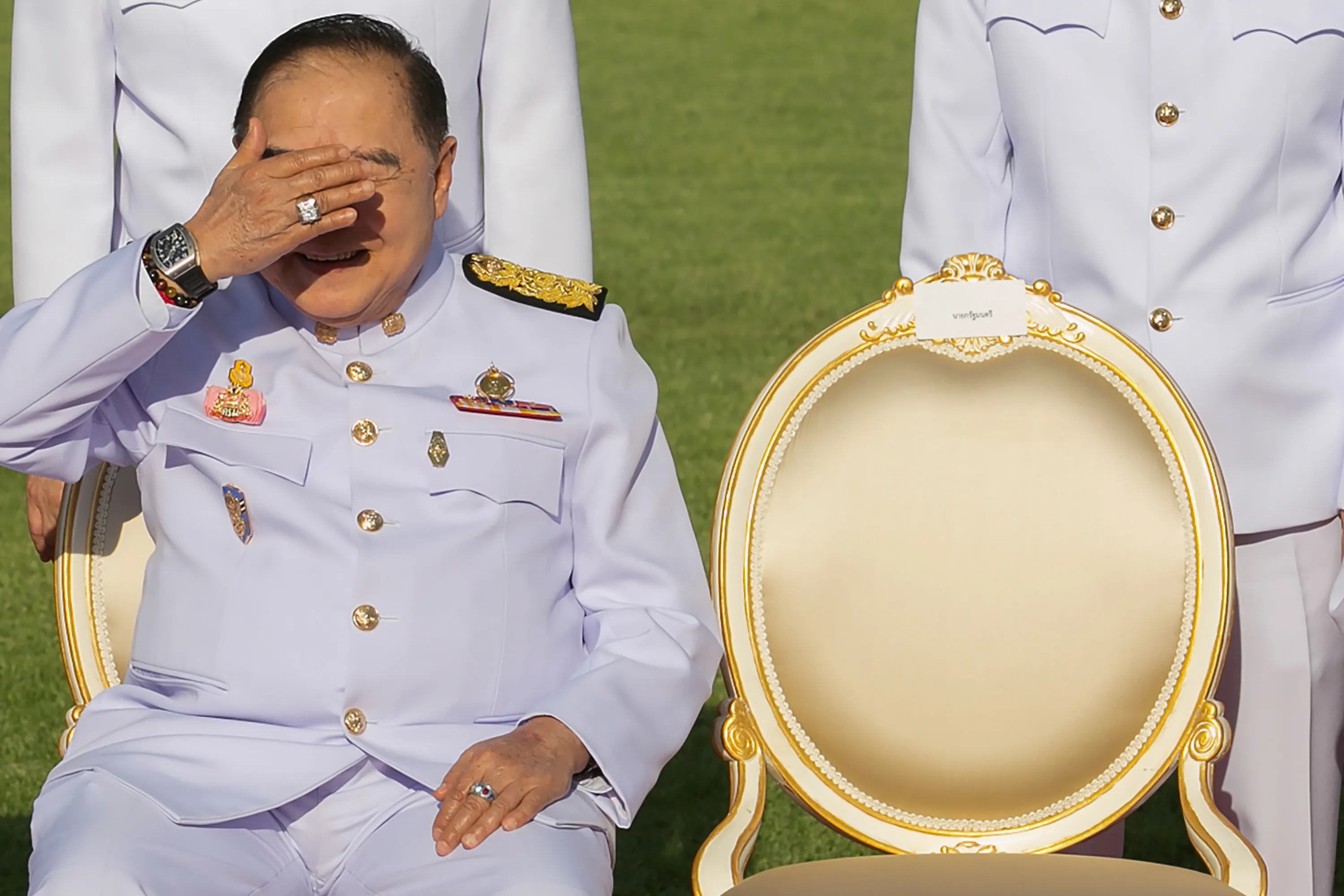 Thailand's Deputy Prime Minister and Defence Minister Prawit Wongsuwan shields his eyes from the sun and displays a watch he is wearing during a photo session at the Government House in Bangkok, Thailand on February 5, 2018. (Photo by Reuters/Stringer)