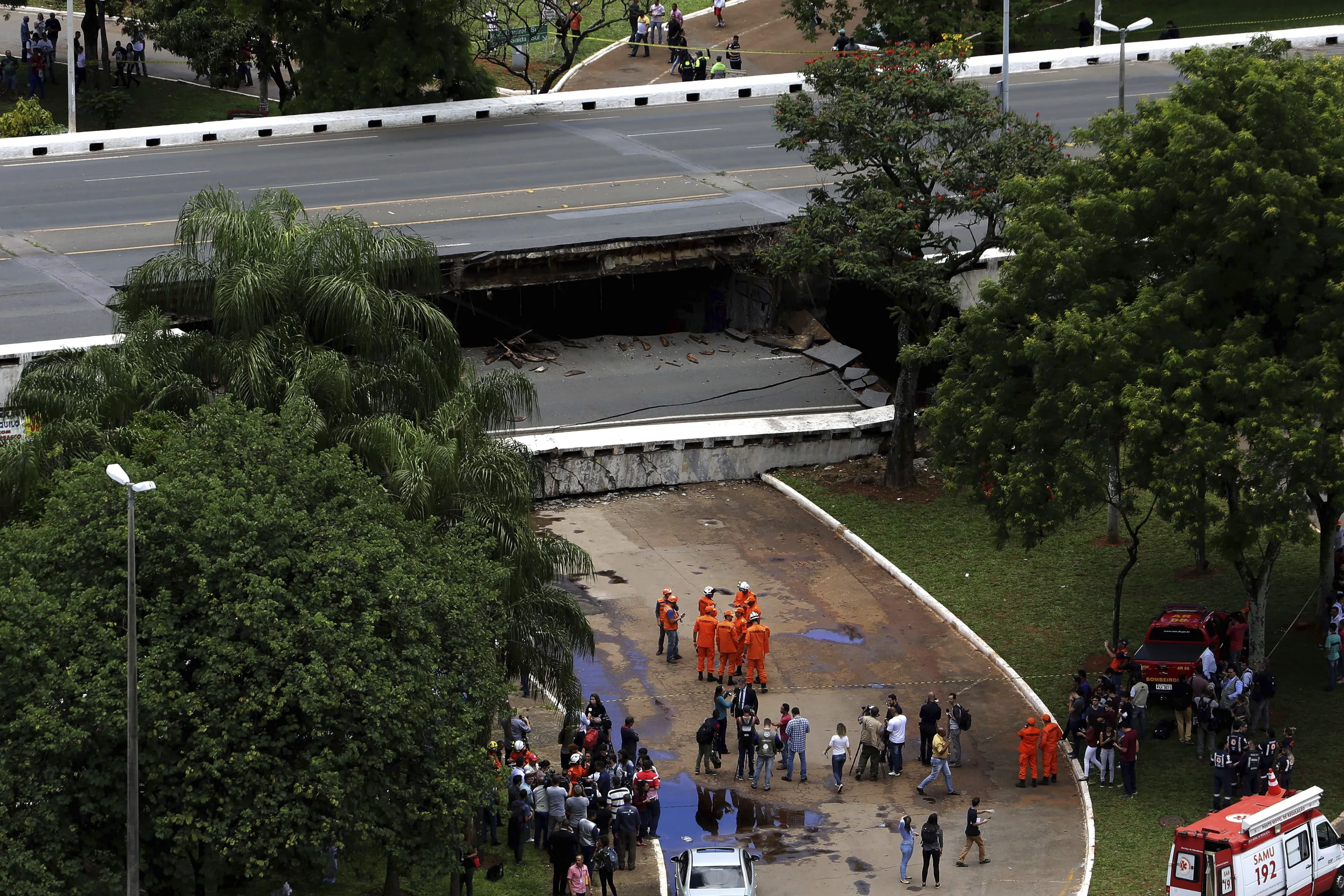 Emergency personnel work on an overpass that collapsed in the center of Brasilia, Brazil, Tuesday, February 6, 2018. The overpass collapsed destroying cars, part of a restaurant and snarling traffic in Brazil's capital. (Photo by Eraldo Peres/AP Photo)