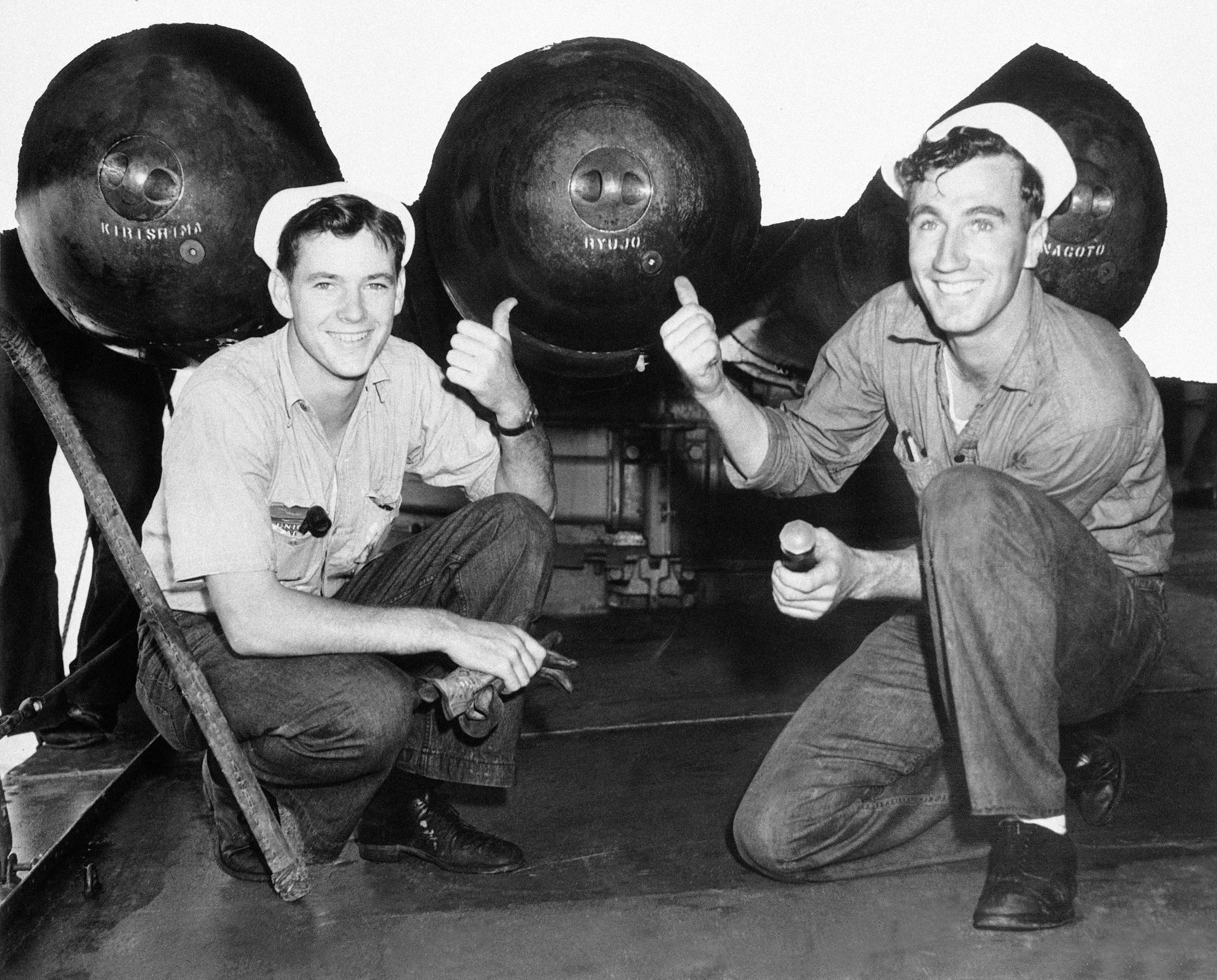Torpedoes and depth charges carried by destroyers of the United States fleet, display a personal touch� these days. These torpedo warheads carry the names of Japanese aircraft carries and battleships shown February 3, 1942. (Photo by AP Photo)