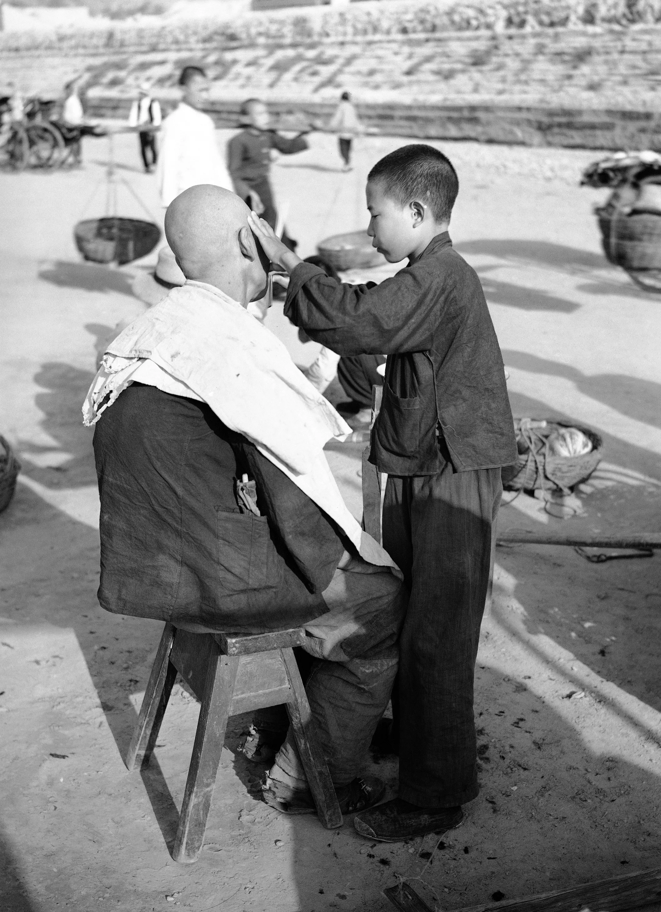 In China boys from 10 to 16 serve as barbers. Their shop is the open street, and anything serves as a chair, a haircut costs a penny, and a shave a half penny. The typical hairdresser's scene, in Peking, on October 23, 1936. (Photo by AP Photo)