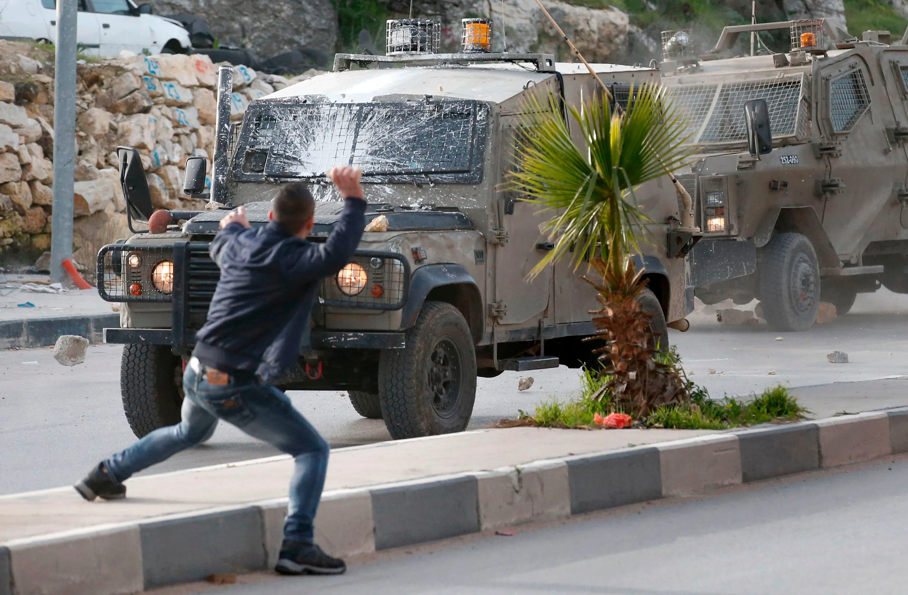 Palestinians throw stones at Israeli army vehicles after forces entered the village of Halhoul in the occupied West Bank on February 07, 2018. A Palestinian stabbed a security guard at the entrance to an Israeli settlement and was shot dead in the latest violence in the occupied West Bank, Israel' s military said. (Photo by Hazem Bader/AFP Photo)