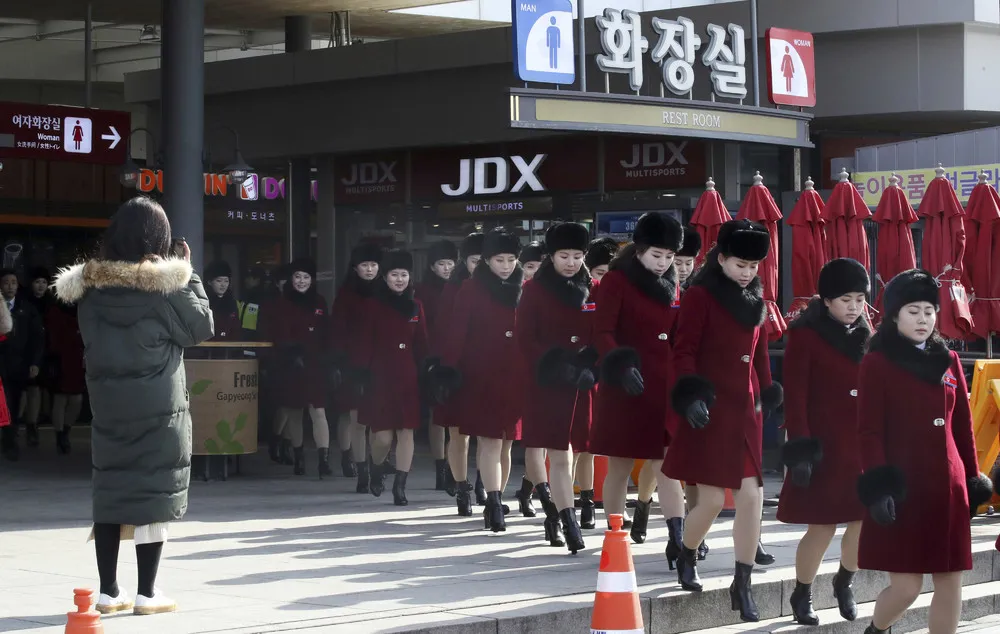 North Korean cheering squads leave an expressway service in Gapyeong, South Korea, Wednesday, February 7, 2018. A North Korean delegation, including members of a state-trained cheering group, arrived in South Korea on Wednesday for the Pyeongchang Winter Olympics. (Photo by Park Dong-ju/Yonhap via AP Photo)