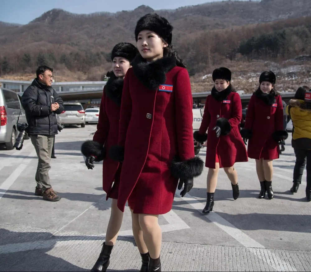 North Korean cheerleaders arrive at a rest stop, or service station, as their bus convoy carrying a 280- member delegation on its way to the 2018 Pyeongchang winter Olympic games, makes its way past Gapyeong on February 7, 2018 More than 200 young North Korean women arrived in South Korea to root for athletes from both sides of the peninsula at the Winter Olympics. (Photo by Ed Jones/AFP Photo)