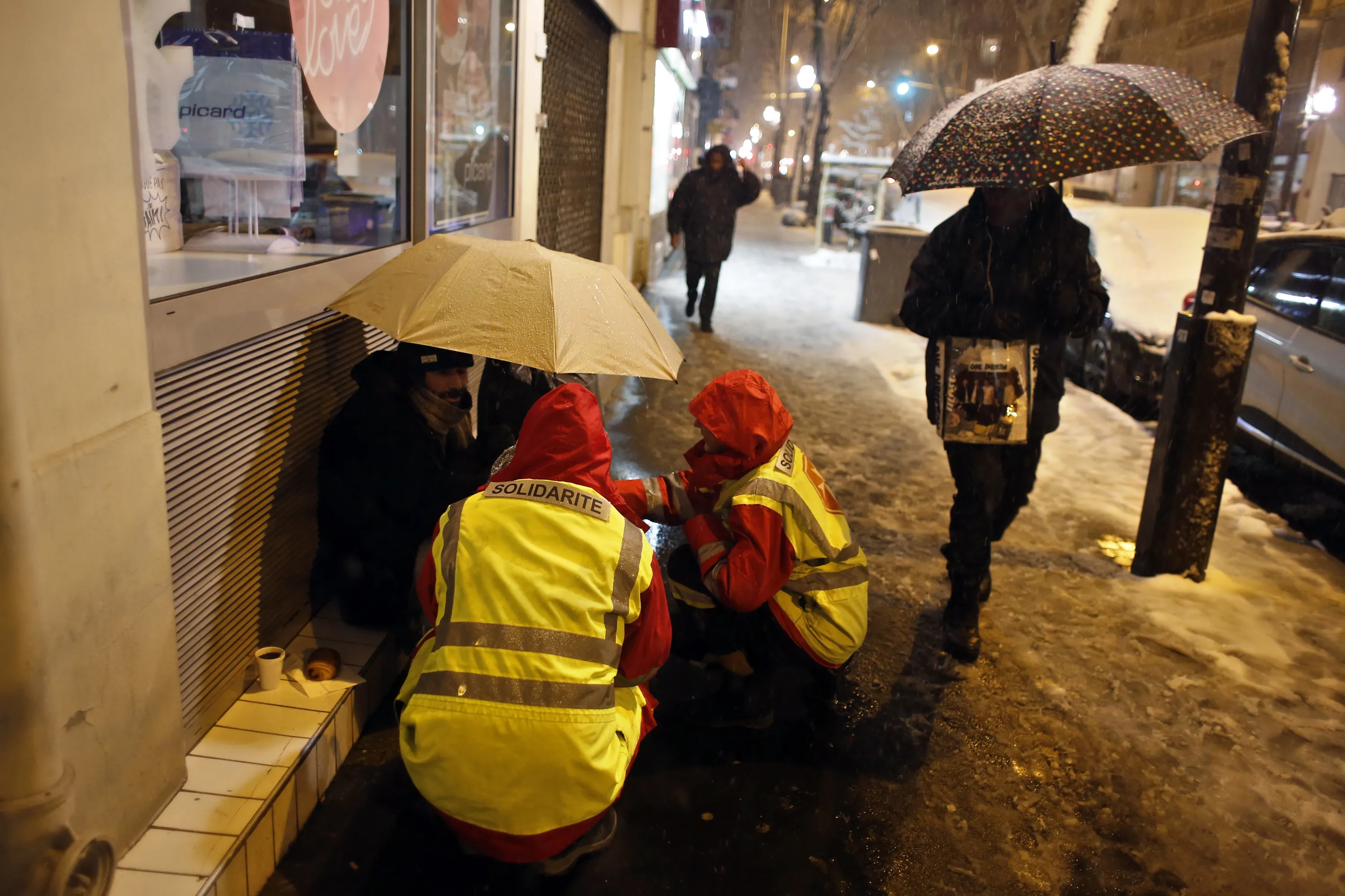 Volunteers from talk with an homeless man in Boulogne Billancourt, west of Paris, Tuesday, February 6, 2018. France's national weather agency Meteo France said Monday about half the country is on alert for dangerous levels of snow and ice. (Photo by Thibault Camus/AP Photo)