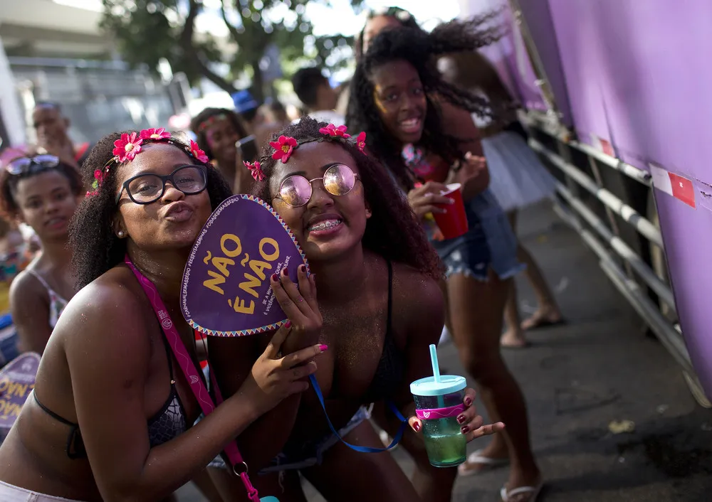 In this February 3, 2018 photo, a woman holds a fan that reads “No' is 'no!” as she strike a pose with friends, during the Simpatia e Quase Amor in Rio de Janeiro, Brazil. Security officials and several non-government groups that have launched campaigns against harassment of women. (Photo by Silvia Izquierdo/AP Photo)