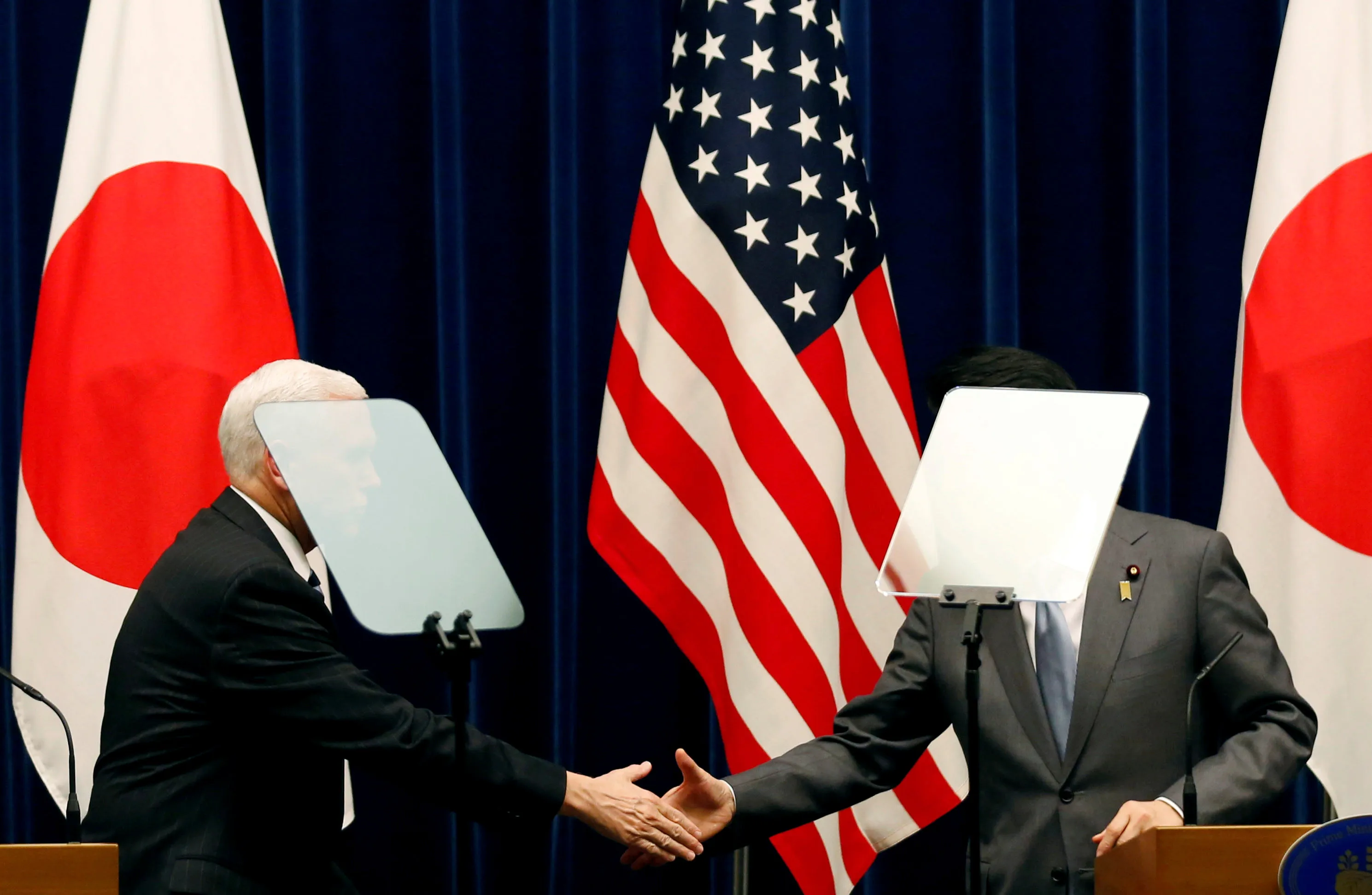U.S. Vice President Mike Pence (L) and Japan's Prime Minister Shinzo Abe shake hands during their joint announcement after their meeting at Abe's official residence in Tokyo, Japan, February 7, 2018. (Photo by Toru Hanai/Reuters)
