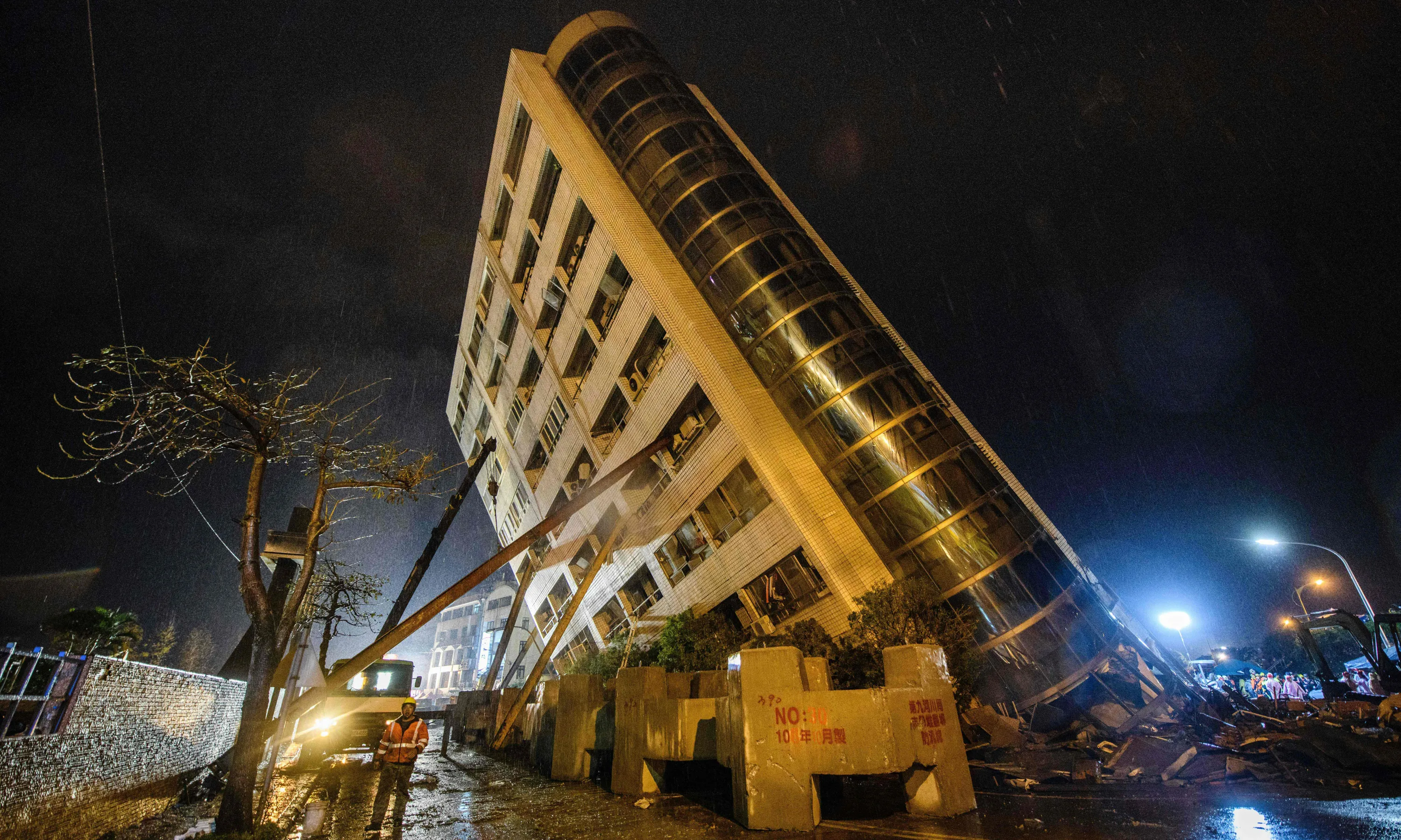 A rescue worker (bottom L) walks past beams used to prop up the Yun Tsui building as it leans to one side after an overnight earthquake in the Taiwanese city of Hualien on February 7, 2018. Rescue workers pulled survivors and bodies from buildings tilting precariously in the Taiwanese city of Hualien on February 7 after an overnight earthquake killed at least six people, injured more than 200 and left dozens missing. Emergency responders were focusing on a 12- storey apartment block and a nearby hotel, both of which were leaning dangerously with their lower floors pancaked after the 6.4- magnitude quake hit the popular tourist city late Tuesday. (Photo by Anthony Wallace/AFP Photo)