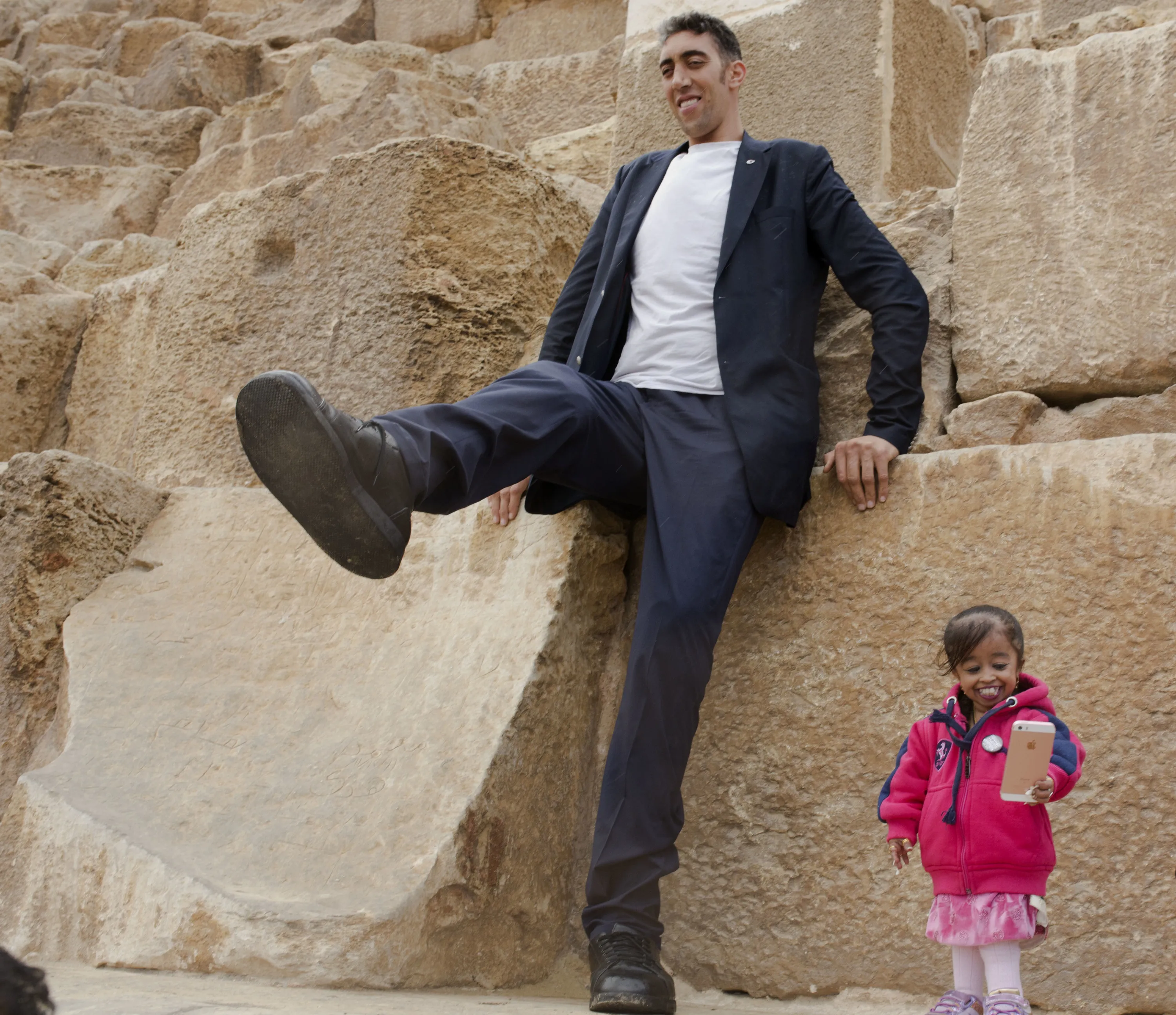 Sultan Kosen, from Turkey, 34, the tallest man on earth according to the Guinness World Records, with a height of 246.5 cm ( 8 feet 1 inch), stands on the Great Pyramid as Jyoti Amge, from India, 24, who holds the Guinness title for world's shortest woman with 62.8 cm (2 ft 06) tall, holds her mobile phone at the historic site of Giza Pyramids in Cairo, Egypt, Friday, January 26, 2018. Both were invited by the Egyptian Tourism Promotion Board to visit Cairo's most famous sites, in an attempt to help boost tourism in Egypt. (Photo by Amr Nabil/AP Photo)