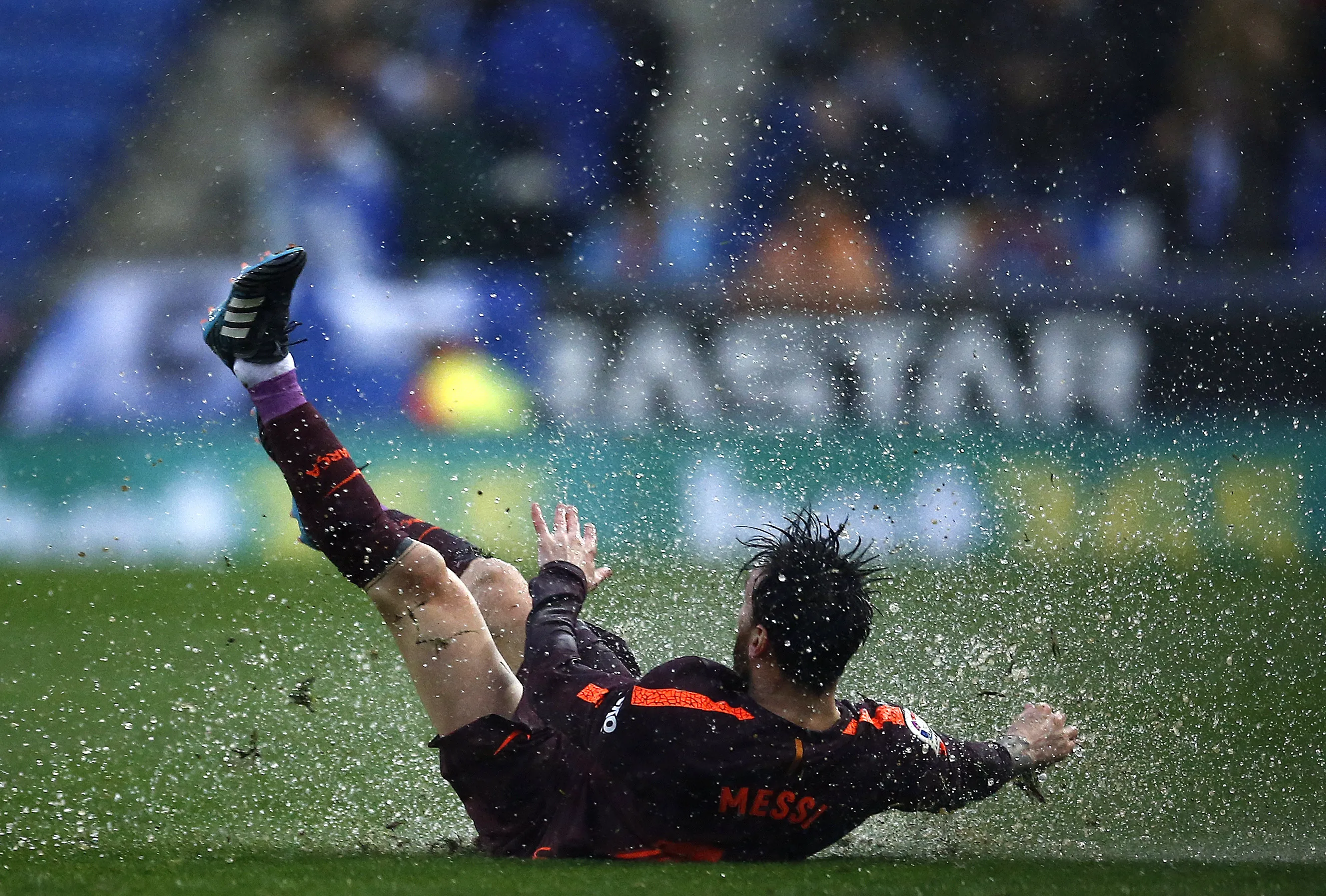 FC Barcelona's Lionel Messi falls during the Spanish La Liga soccer match between Espanyol and FC Barcelona at RCDE stadium in Cornella Llobregat, Spain, Sunday, February 4, 2018. (Photo by Manu Fernandez/AP Photo)